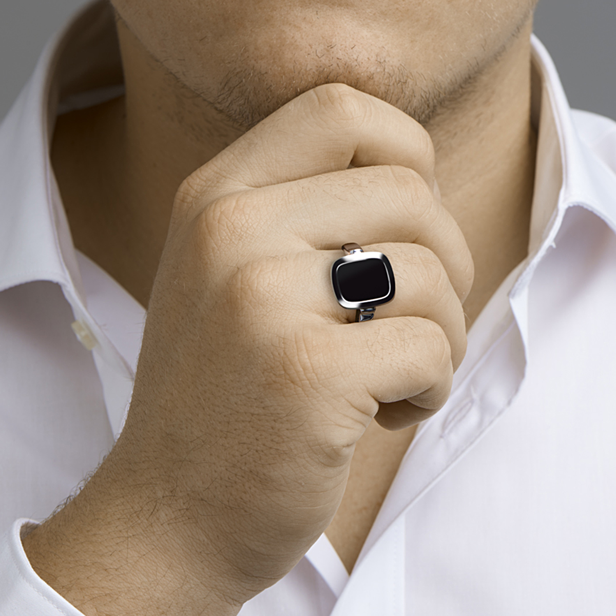 Gerhodineerd 925 zilveren zegelring uitgevoerd met een onyx. De ring heeft een breedte van 15.5mm.