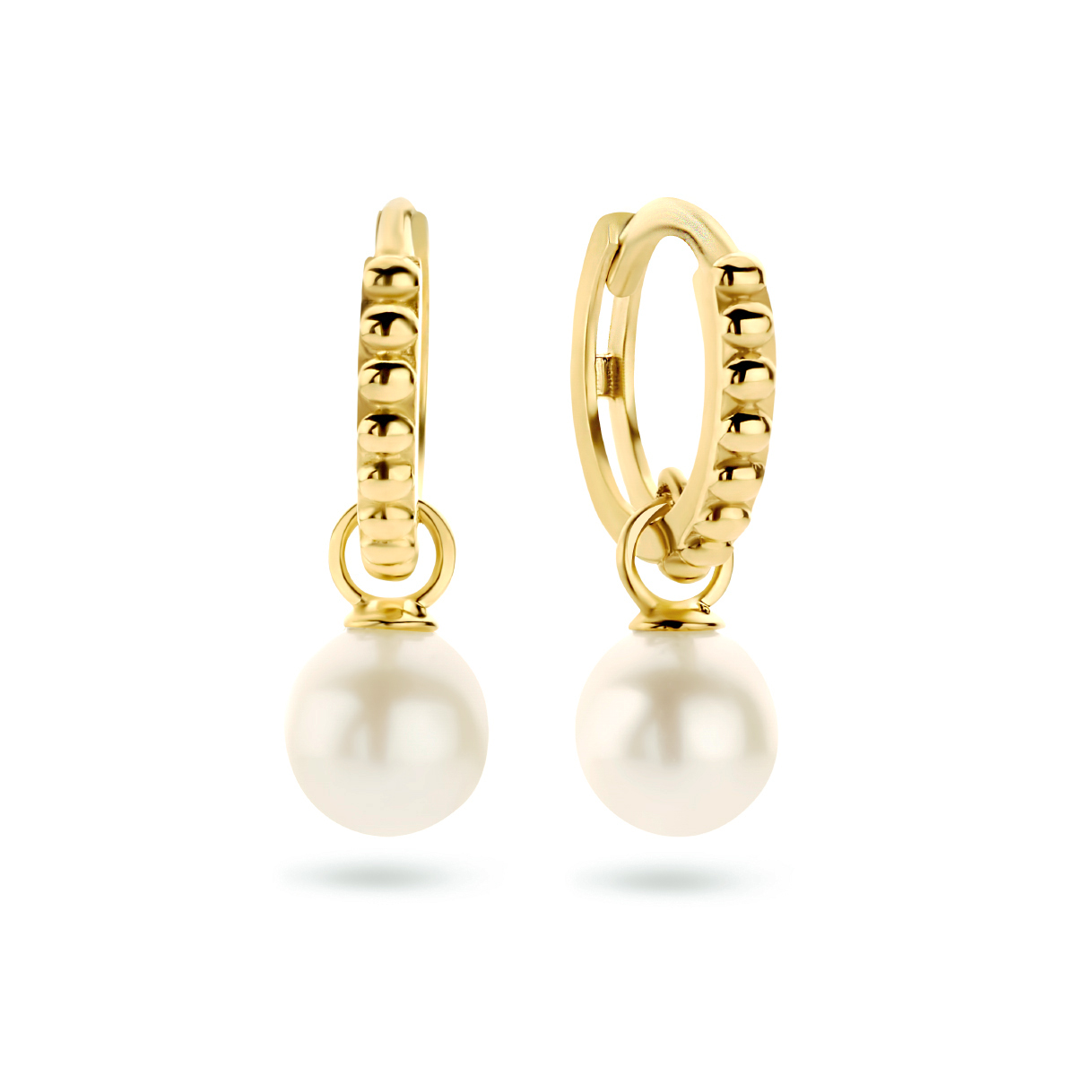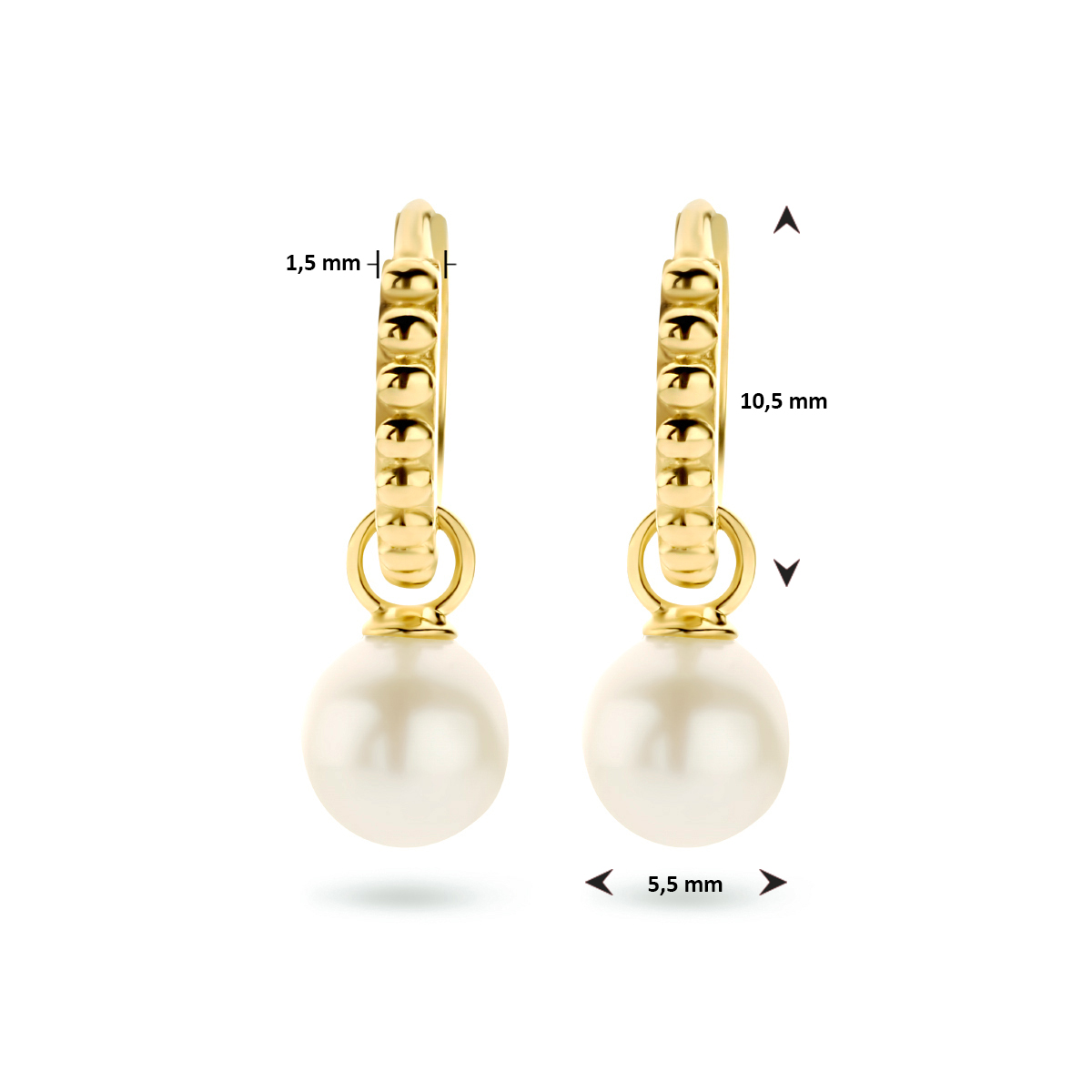 14krt geelgouden parel klapoorringen. De klapoorringen hebben een afmeting van 10.5x1.5mm en de parel heeft een diameter van 5.5mm.
