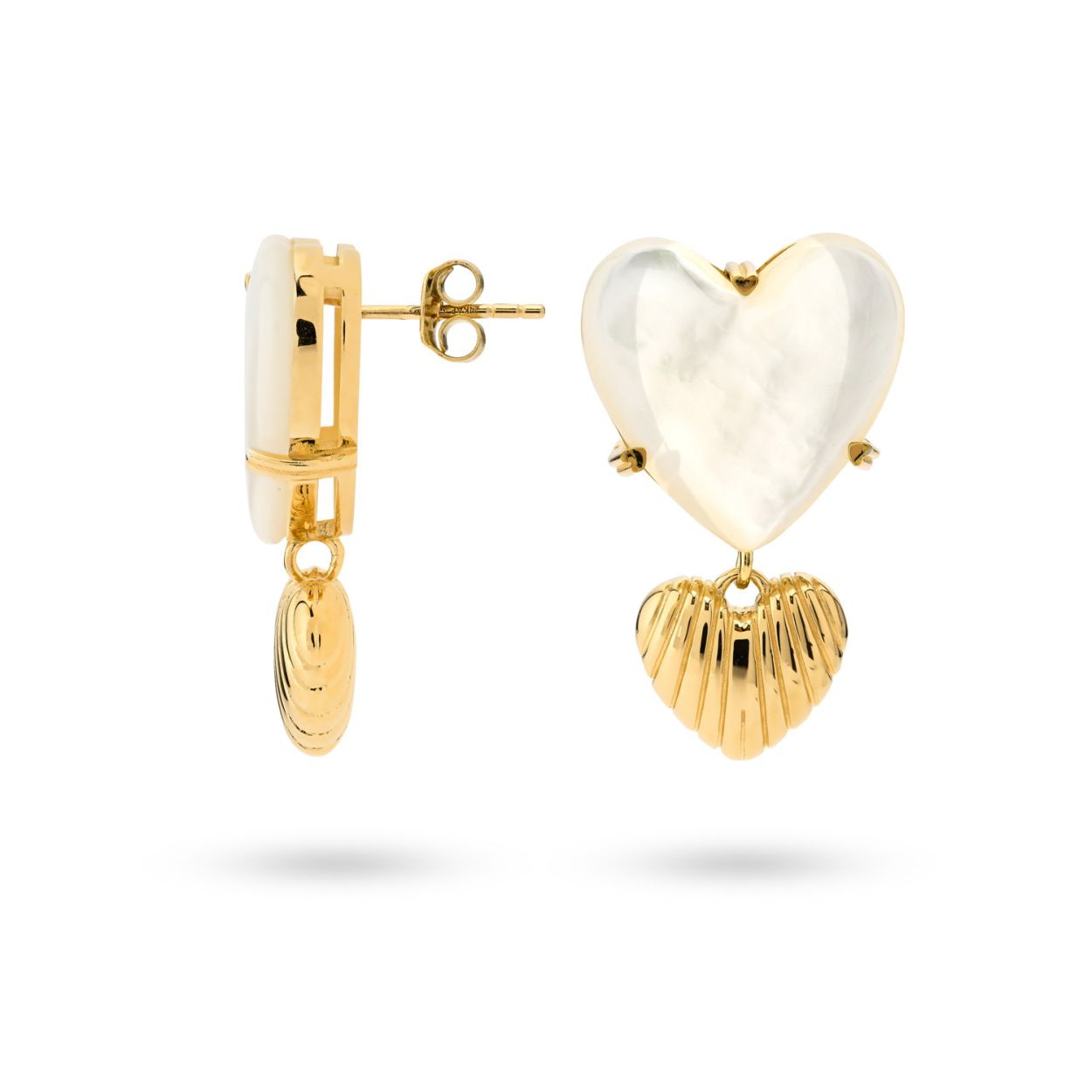 Mother of pearl. Deze prachtige oorbellen bevatten een grote hartvormige parel, met daaronder een goud hart met een schelp structuur. Combineer deze oorbellen met de bijpassende ketting voor een echte eye-catching look! Deze oorbellen zijn gemaakt van 925 sterling zilver en verguld met 18K goud. Elk 24Kae sieraad is met liefde en oog voor detail ontworpen door Kae Sutherland.