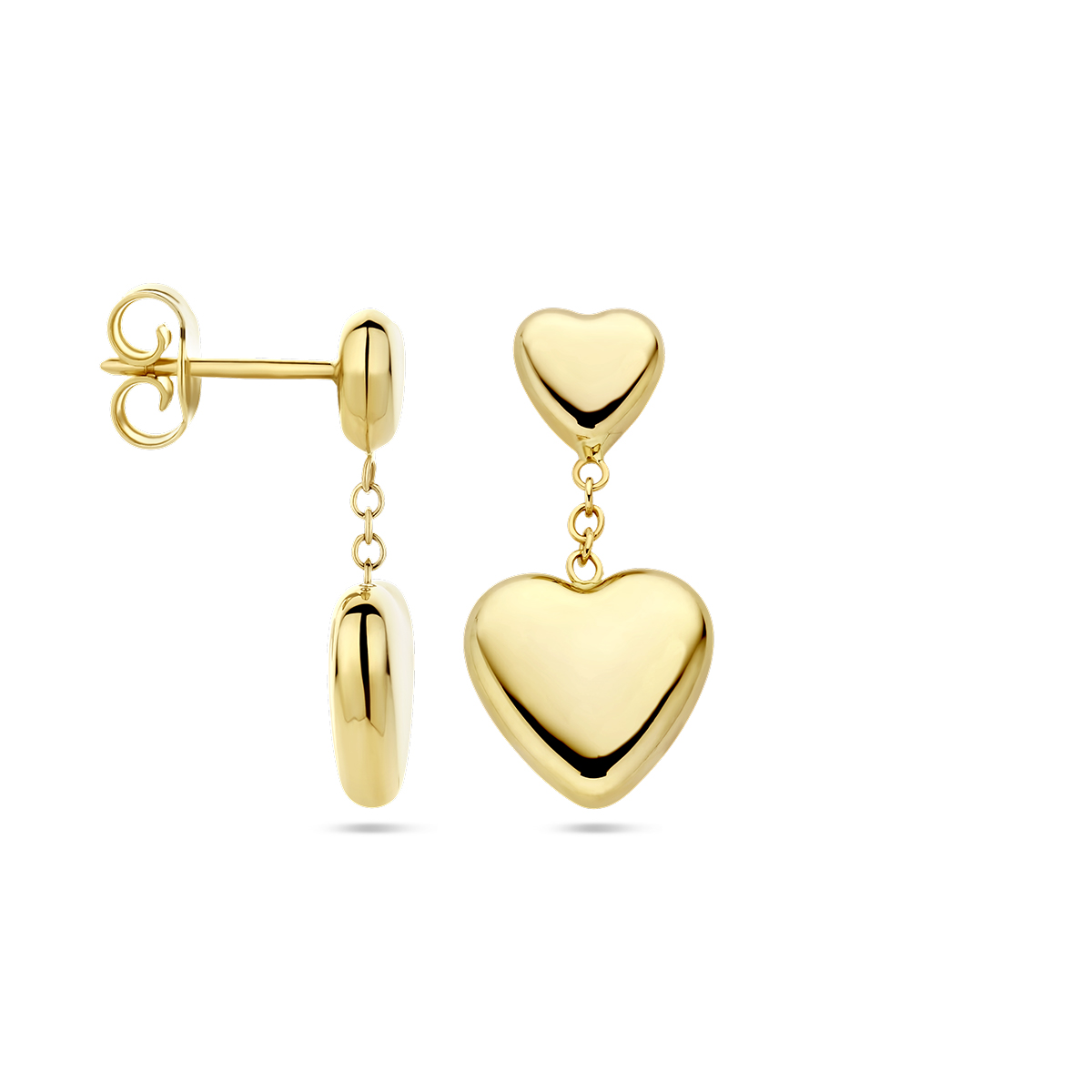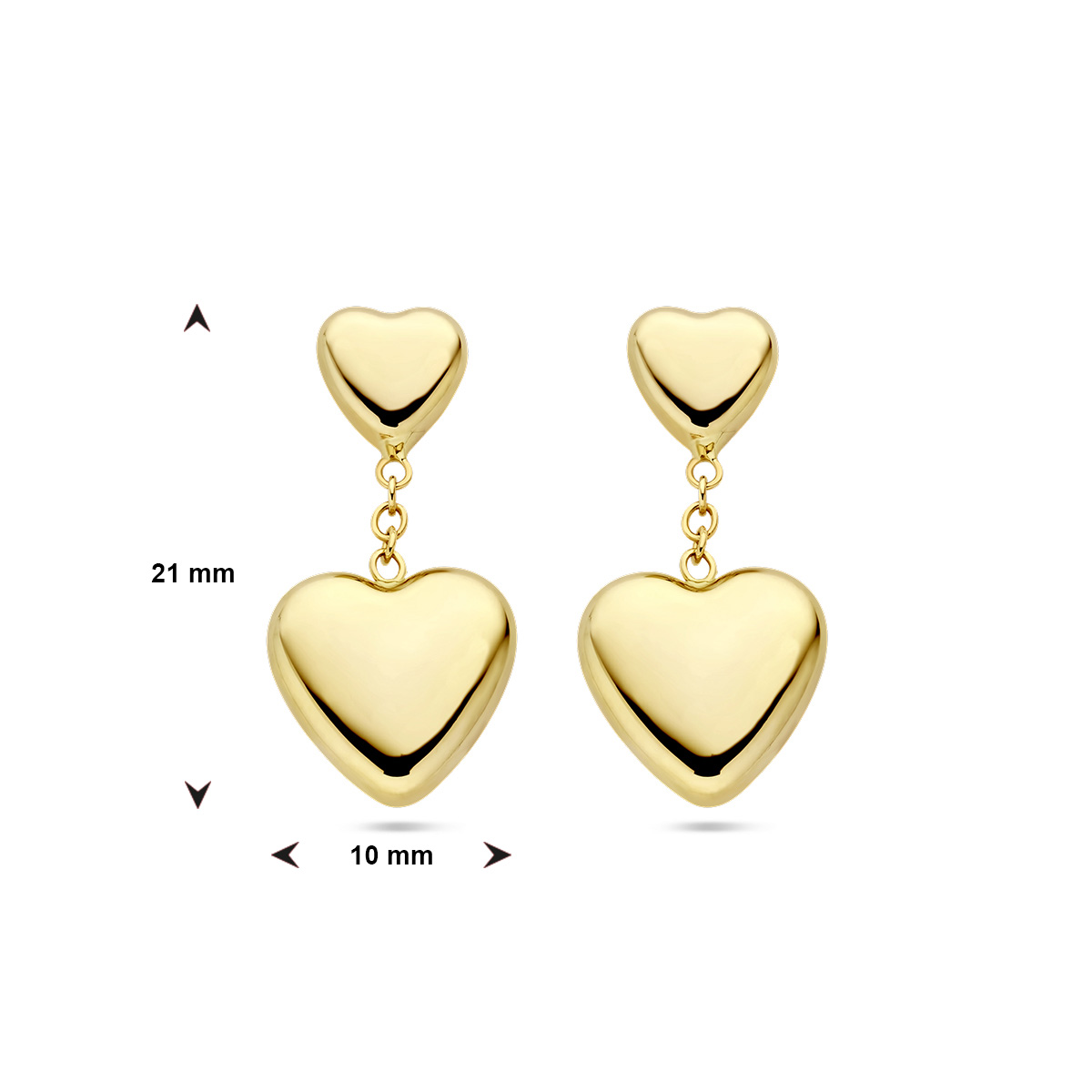 14k Geelgouden oorhangers uitgevoerd met hartjes. De hartjes hebben 2 verschillende afmetingen, 6x6mm en 10x10mm. De totale hoogte is 2.1cm.
