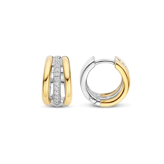 Deze TI SENTO oorbellen 78010ZY combineren diepte, contrast en schittering. Gemaakt van 925 sterling zilver, hebben ze een driedubbel hoepelontwerp: twee goudkleurige banden omarmen een platinakleurige hoepel met pavé gezette cubic zirconia. Deze oorbellen voegen een elegante touch toe aan elke outfit. De veilige scharnier sluiting zorgt voor comfort, waardoor ze de hele dag gedragen kunnen worden. Nikkelvrij en hypoallergeen voor luxueus comfort. Een mix van gouden warmte, ijzige schittering en eigentijds design, perfect voor elke gelegenheid.