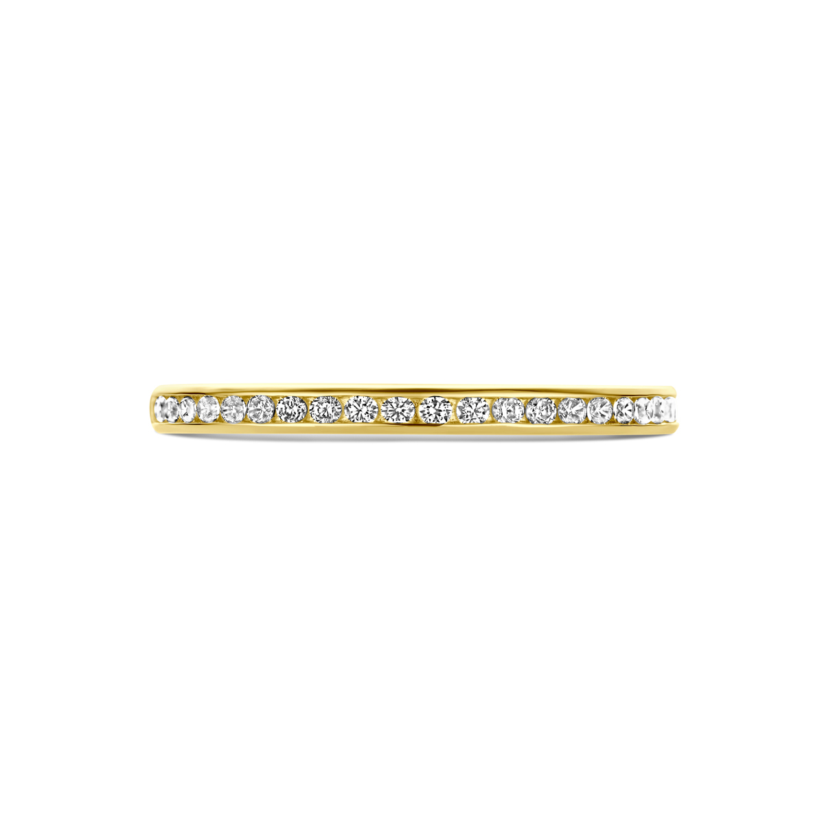 Beschrijving: Stijlvolle geelgouden aanschuifring met een schitterende rij van zirkonia en een poli afwerking. Tip: Combineer deze ring met andere aanschuifringen voor een subtiele en elegante look.
