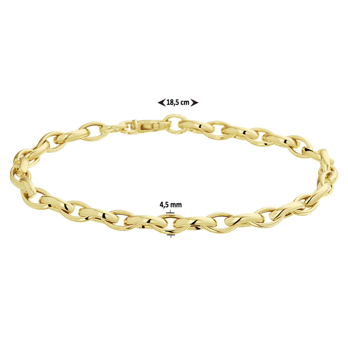 Geelgouden armband met een 4.5mm breed anker schakel en een lengte van 18.5cm uitgevoerd met een stevige karabijn sluiting. De armband is te combineren met bijpassende sieraden.