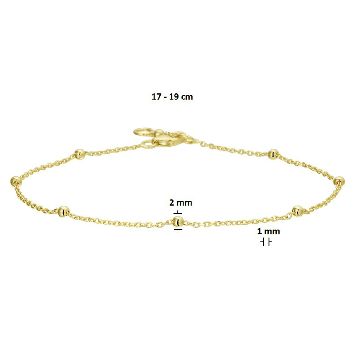Geelgouden 1mm anker armband met draaglengtes van 17 en 19 cm uitgevoerd met bolletjes van 2mm en een stevige karabijn sluiting. De armband is te combineren met bijpassende sieraden uit onze collectie.