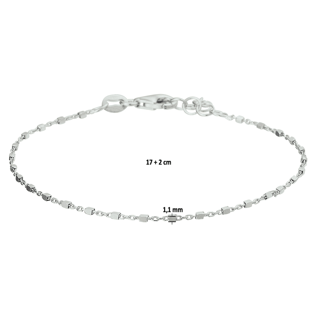 Beschrijving: Fijn gerhodineerd zilveren 1.1mm blokjes armband met een lengte van 17cm met een extensie van 2cm uitgevoerd een stevige karabijn sluiting. Tip: De armband is te combineren met bijpassende sieraden uit onze collectie.