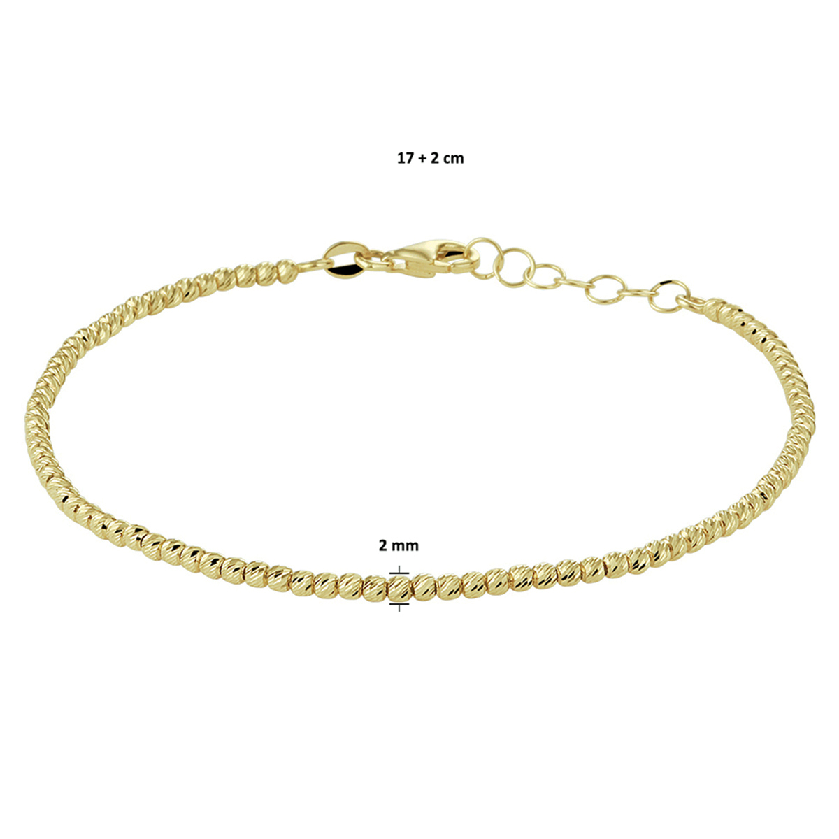 Beschrijving: Fijn geelgouden armband met een draaglengte van 17cm en een extensie van 2cm. De armband heeft gediamanteerde bolletjes met een diameter van 2mm en is uitgevoerd met een stevige karabijn sluiting. Goed te combineren met bijpassende sieraden uit onze collectie.