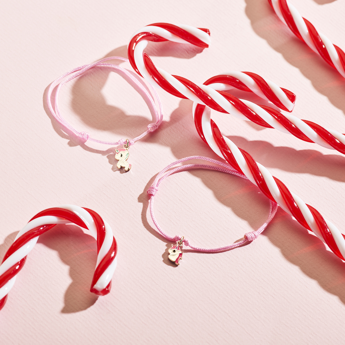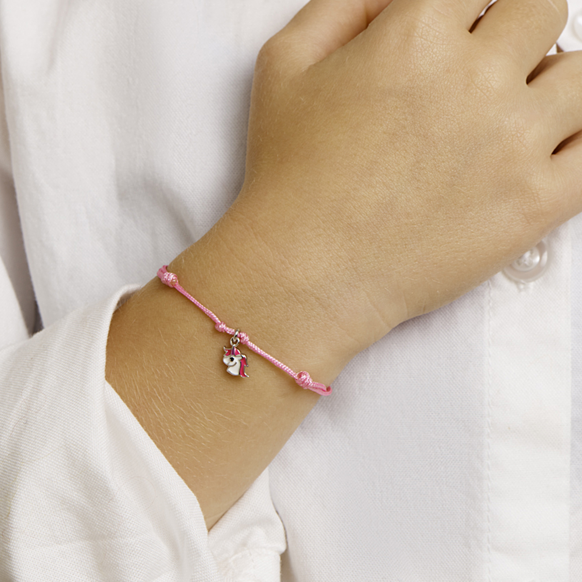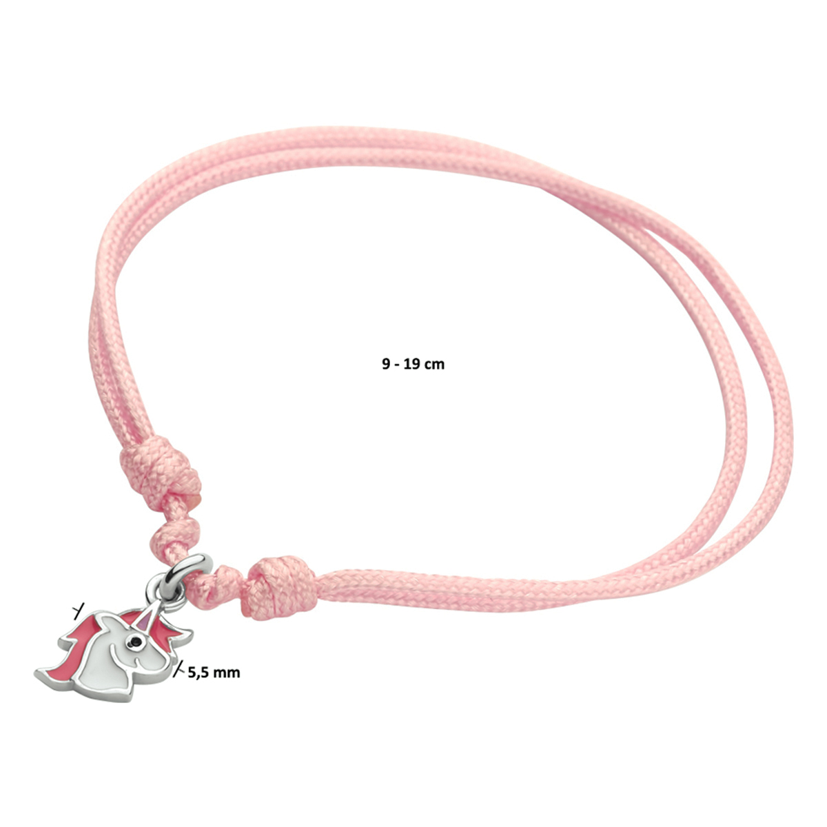 Roze gevlochten armband uitgevoerd met een hanger in de vorm van een eenhoorn. De armband heeft draaglengtes van 9 tot 19cm. De hanger heeft een afmeting van 10x5.5mm.