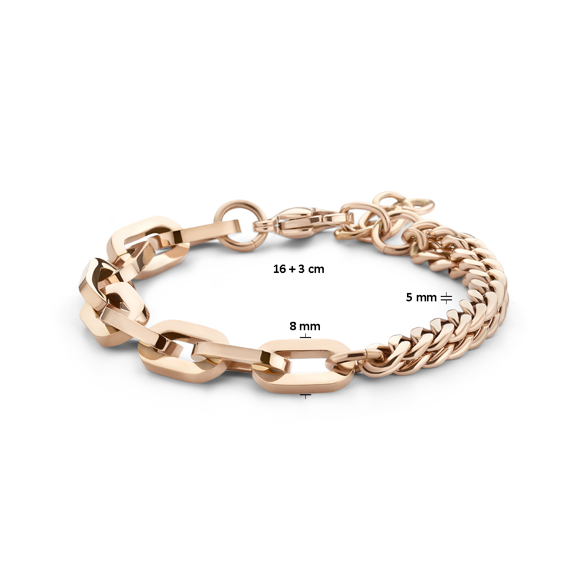Stalen armband met rosekleurige ion plating en is uitgevoerd met een karabijnsluiting. De armband heeft een paperclip schakel van 8mm en twee gourmette schakels van 5mm. De lengte is 16cm met 3cm extensie. Geen garantie op de plating.