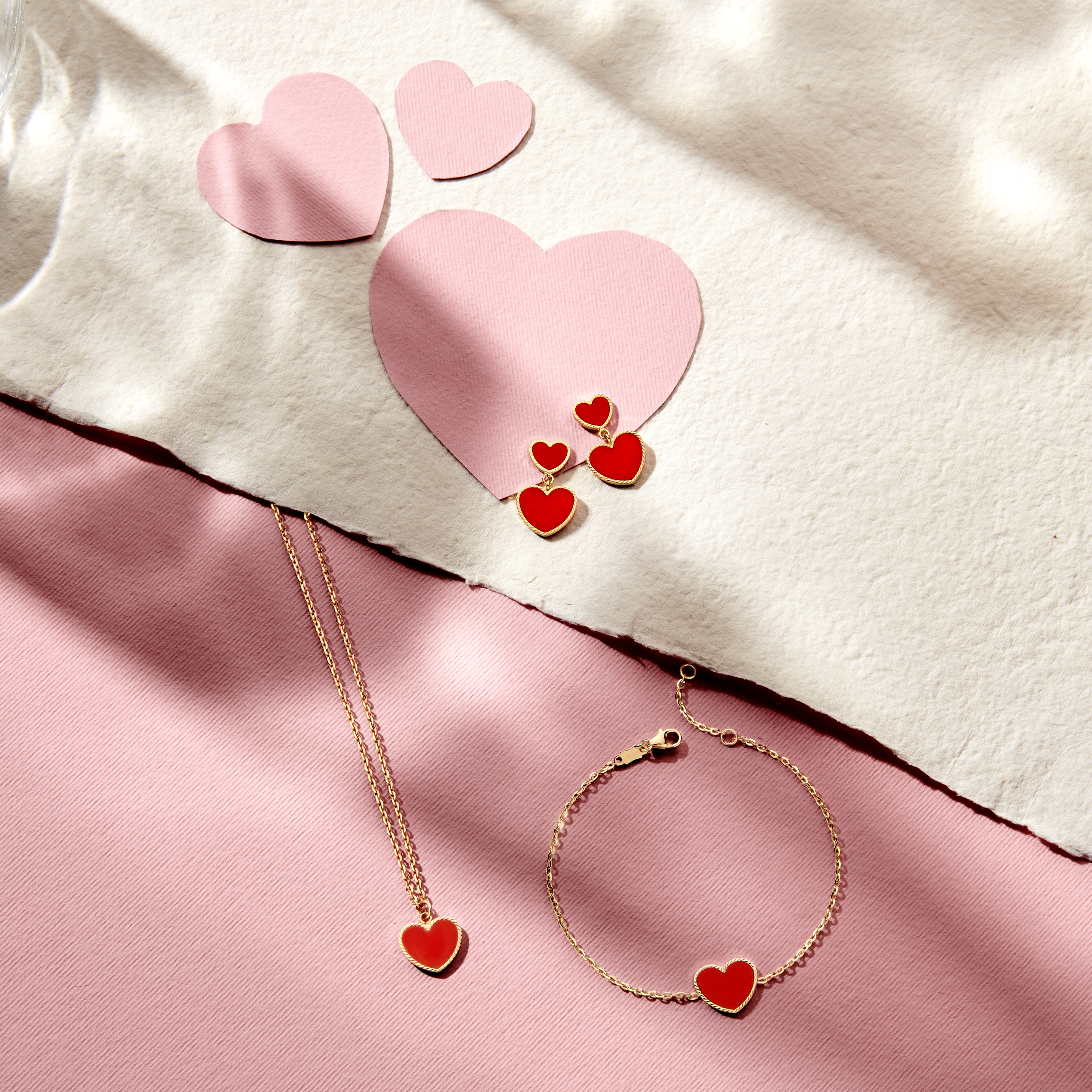 14k Geelgouden armband uitgevoerd met hart en rode pasta. De armband heeft een schakelbreedte van 1.5mm en draaglengtes van 16-18cm. Uitgevoerd met karabijnsluiting.