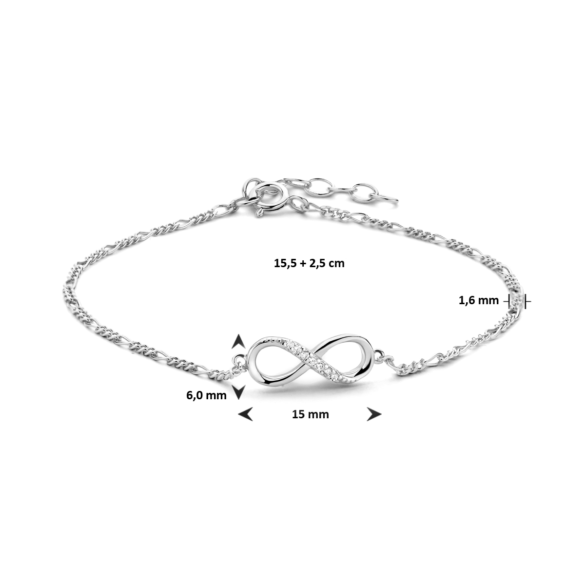 Gerhodineerd 925 zilveren figaro armband met een infinity hanger. De armband heeft een draaglengte van 15.5cm en een extensie van 2.5cm.
