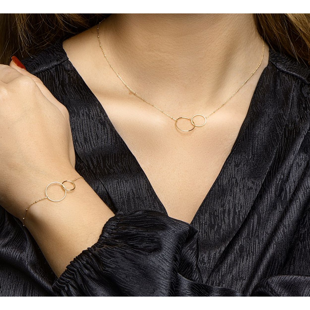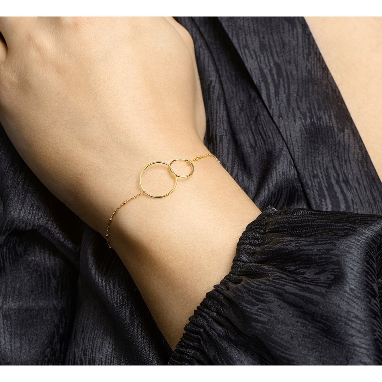 14k Geelgouden armband uitgevoerd met twee rondjes. De armband heeft een draaglengte van 16cm met een extensie van 2cm. De rondjes hebben een diameter van 8 en 13mm.