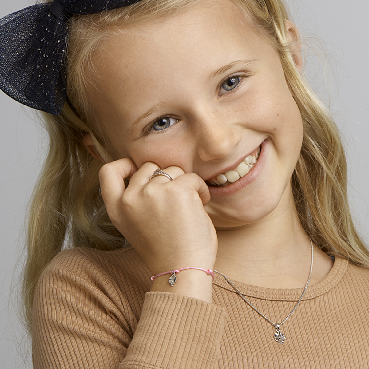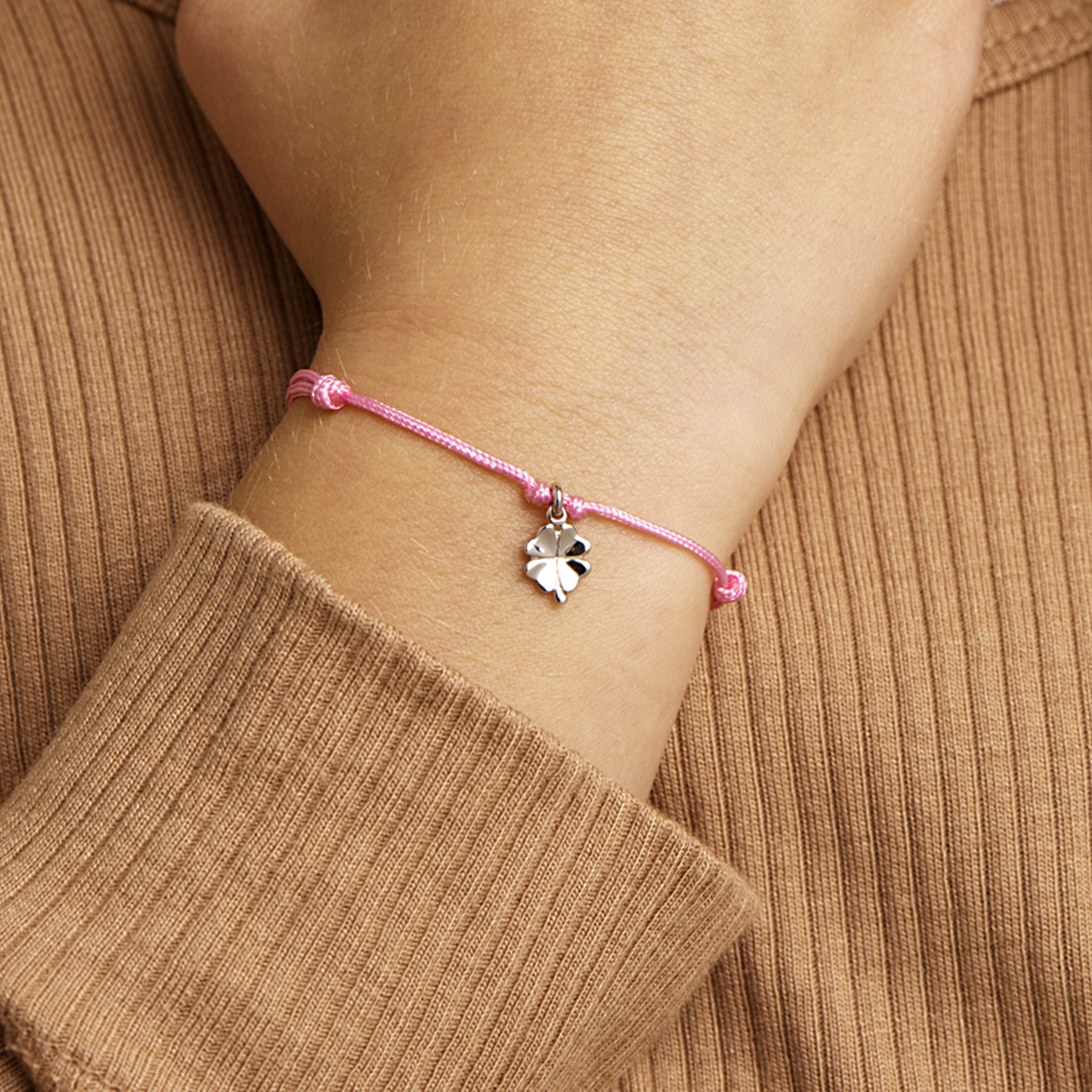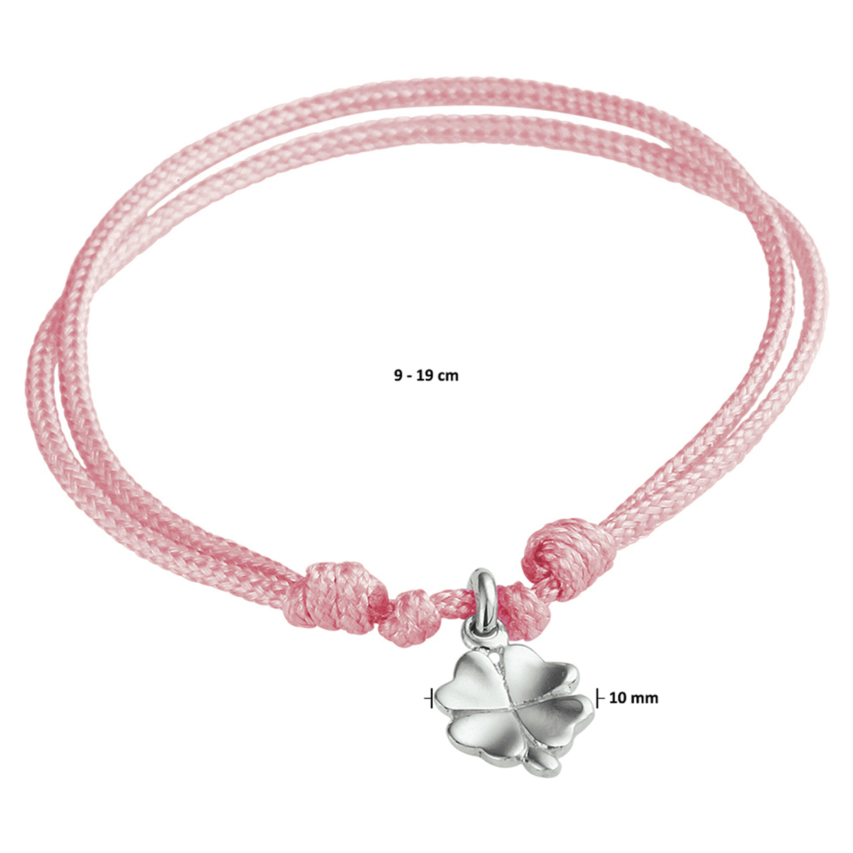 Roze gevlochten armband uitgevoerd met een hanger in de vorm van een klavertje. De armband heeft draaglengtes van 9 t/m 19cm. De hanger heeft een afmeting van 10x10mm.
