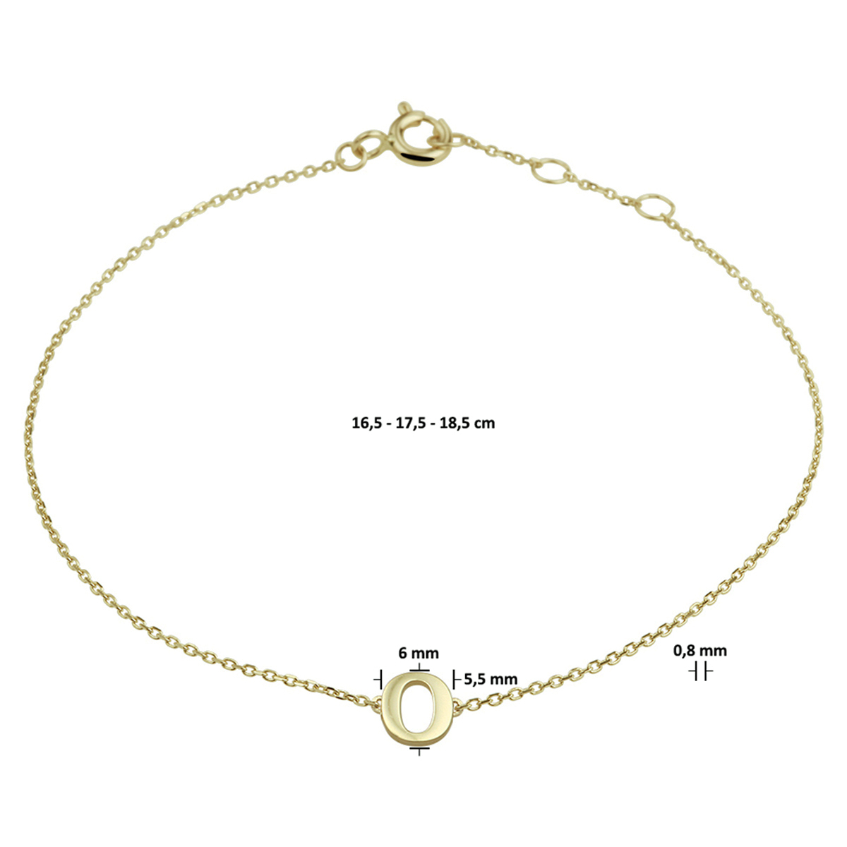 14k Geelgouden anker armband uitgevoerd met de letter O. De armband heeft draaglengtes van 16.5, 17.5 en 18.5cm. De letter heeft een afmeting van 6x5.5mm.