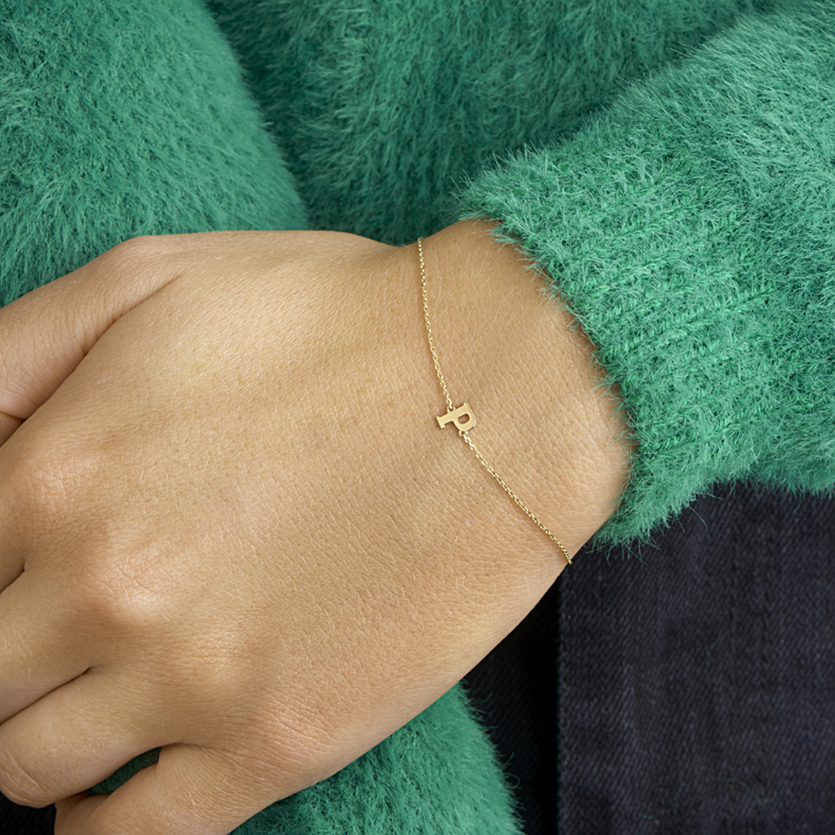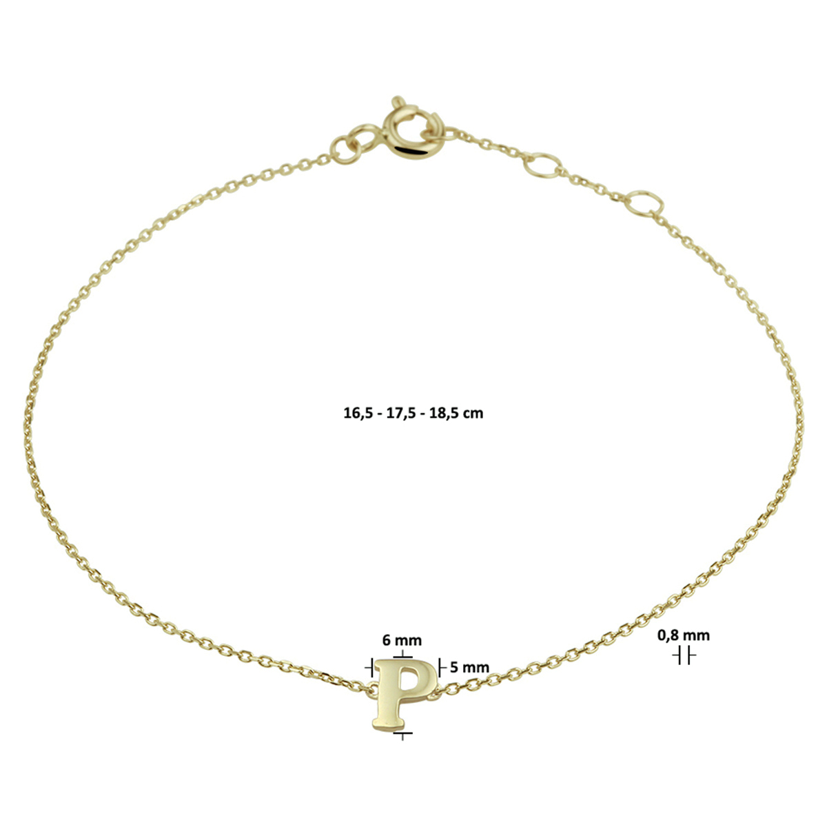 14k Geelgouden anker armband uitgevoerd met de letter P. De armband heeft draaglengtes van 16.5, 17.5 en 18.5cm. De letter heeft een afmeting van 6x5mm.