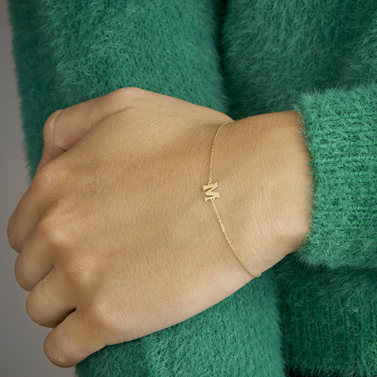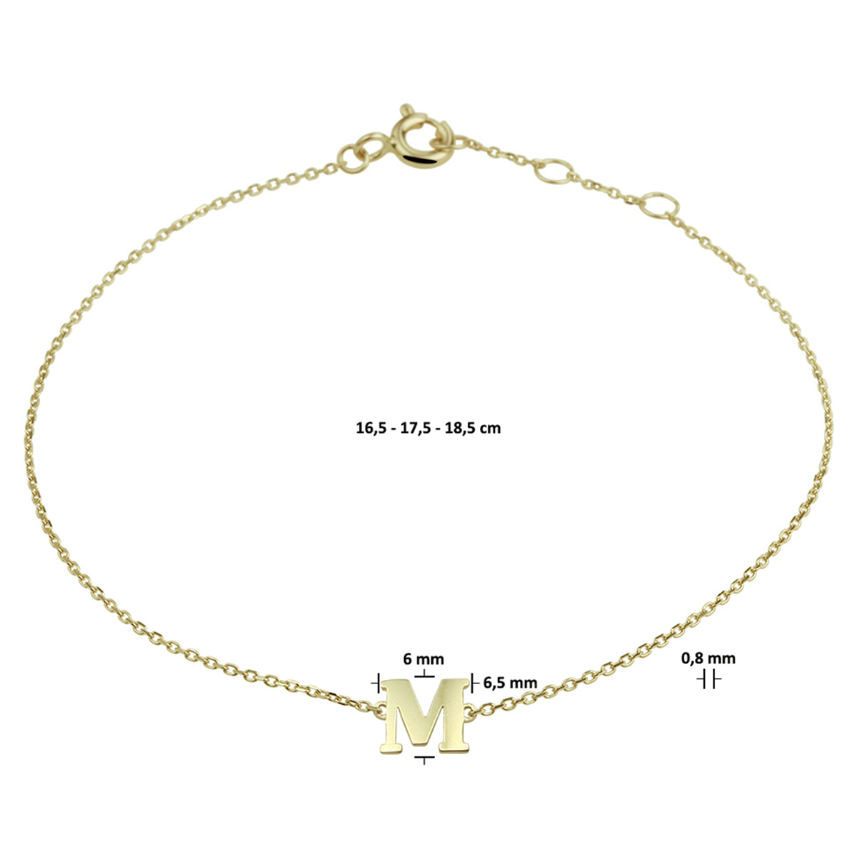 14k Geelgouden anker armband uitgevoerd met de letter M. De armband heeft draaglengtes van 16.5, 17.5 en 18.5cm. De letter heeft een afmeting van 6x6.5mm.