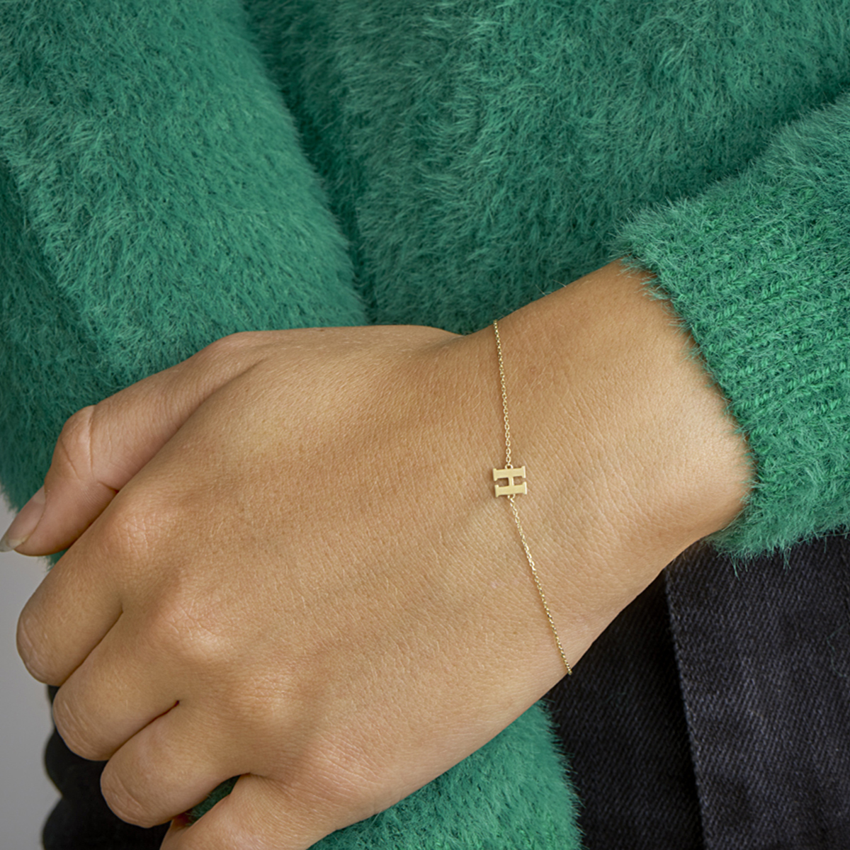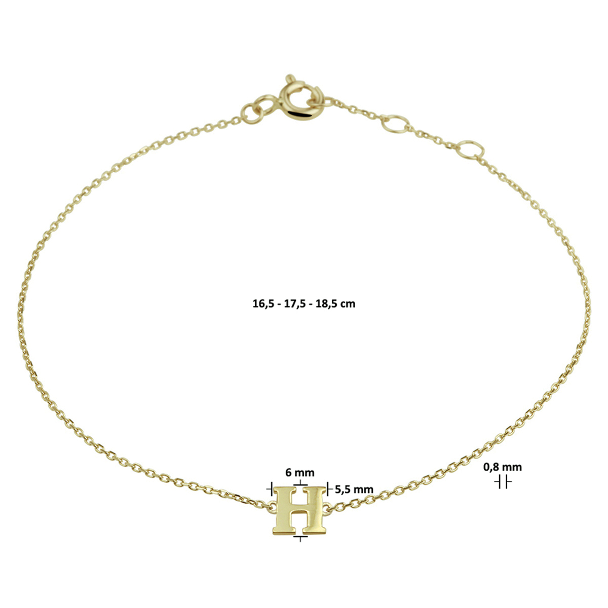 14k Geelgouden anker armband uitgevoerd met de letter H. De armband heeft draaglengtes van 16.5, 17.5 en 18.5cm. De letter heeft een afmeting van 6x5.5mm.