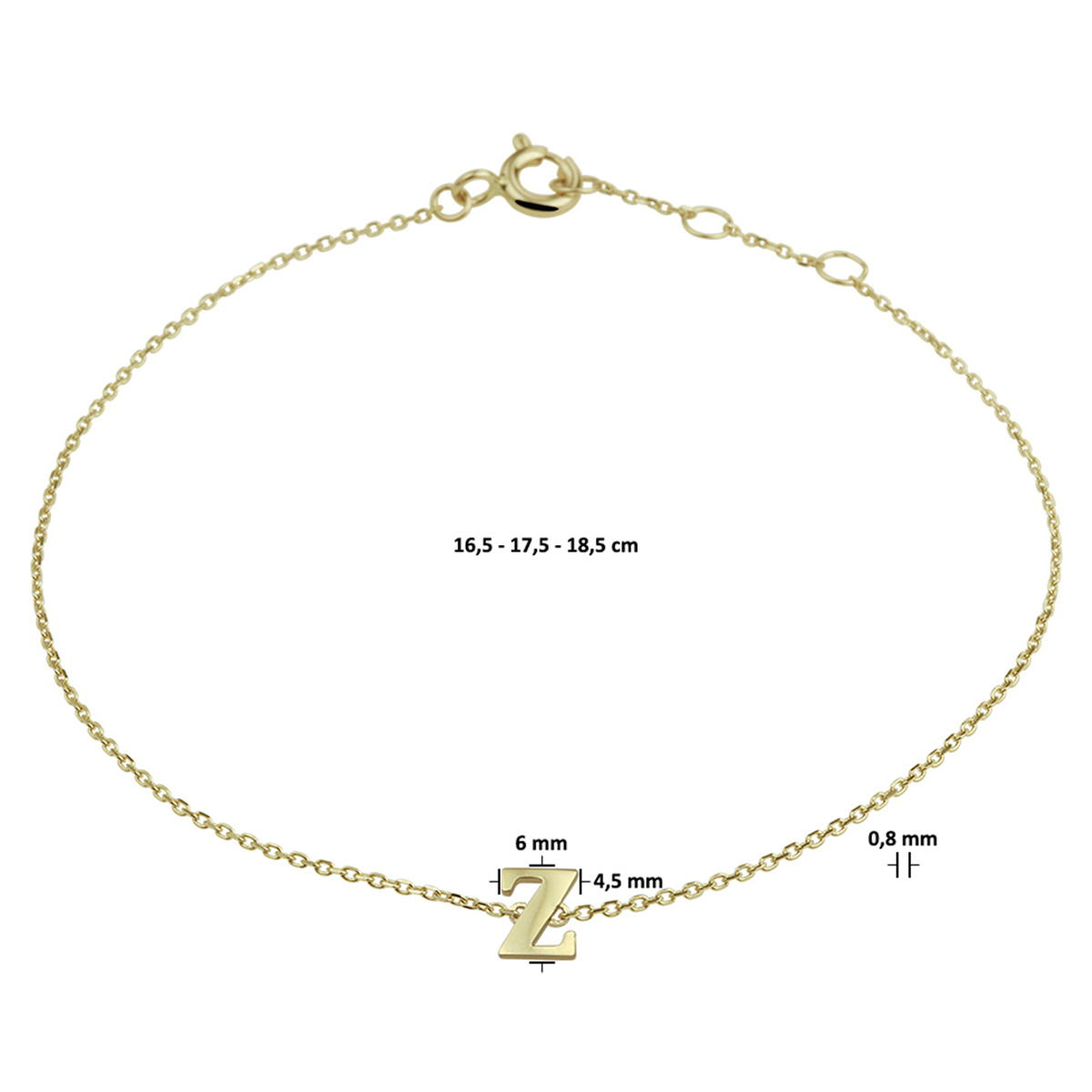 14k Geelgouden anker armband uitgevoerd met de letter Z. De armband heeft draaglengtes van 16.5, 17.5 en 18.5cm. De letter heeft een afmeting van 6x4.5mm.