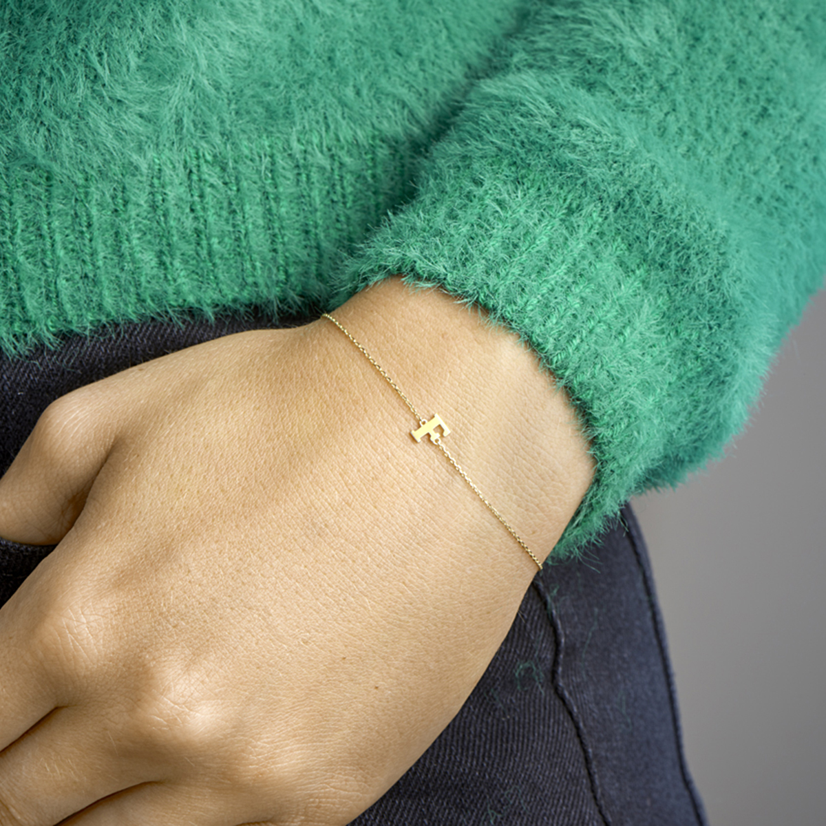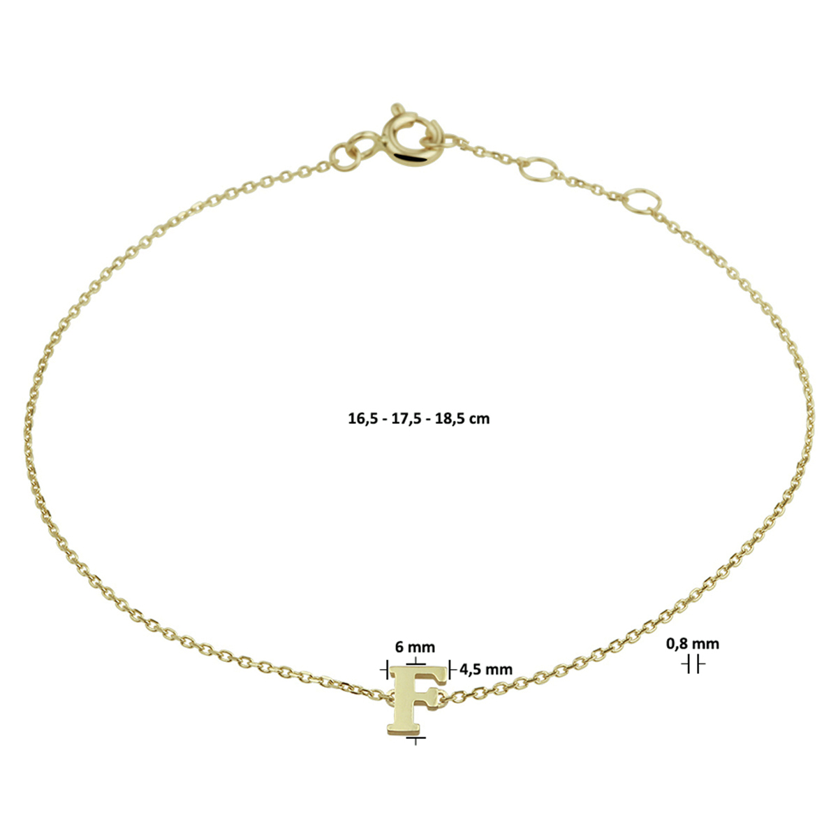 14k Geelgouden anker armband uitgevoerd met de letter F. De armband heeft draaglengtes van 16.5, 17.5 en 18.5cm. De letter heeft een afmeting van 6x4.5mm.