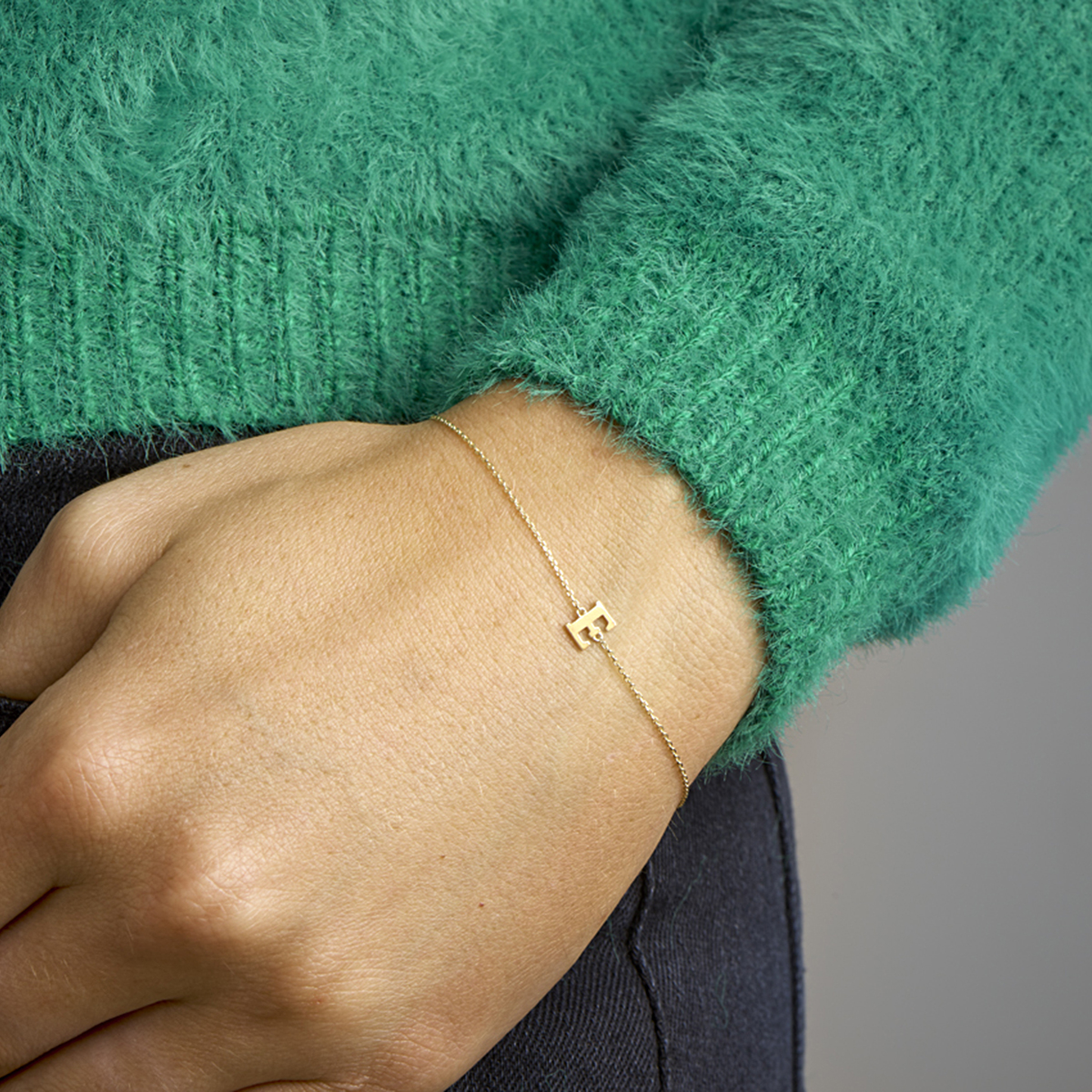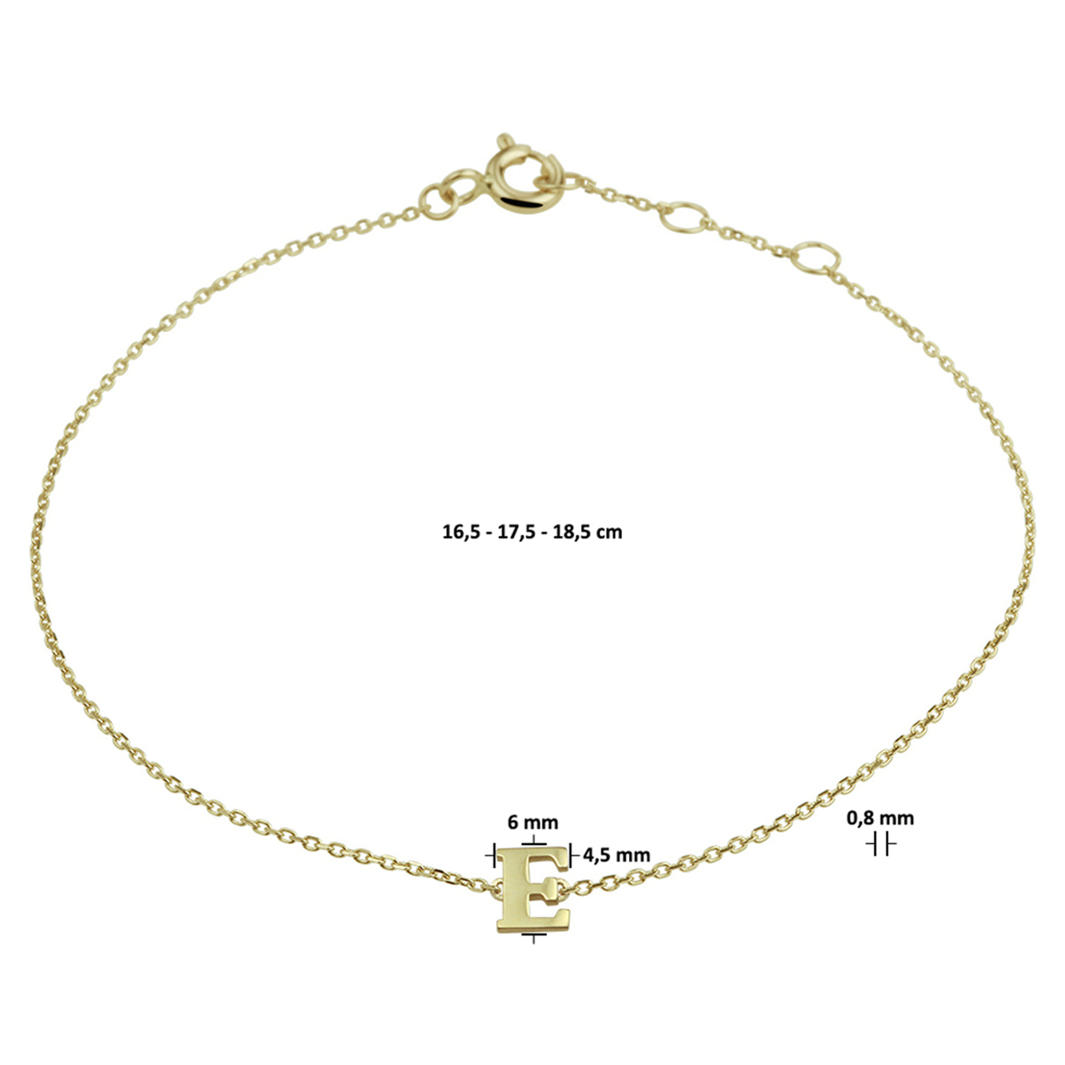 14k Geelgouden anker armband uitgevoerd met de letter E. De armband heeft draaglengtes van 16.5, 17.5 en 18.5cm. De letter heeft een afmeting van 6x4.5mm.