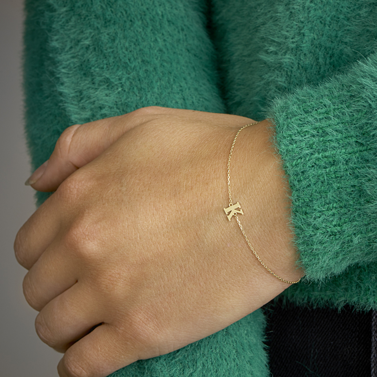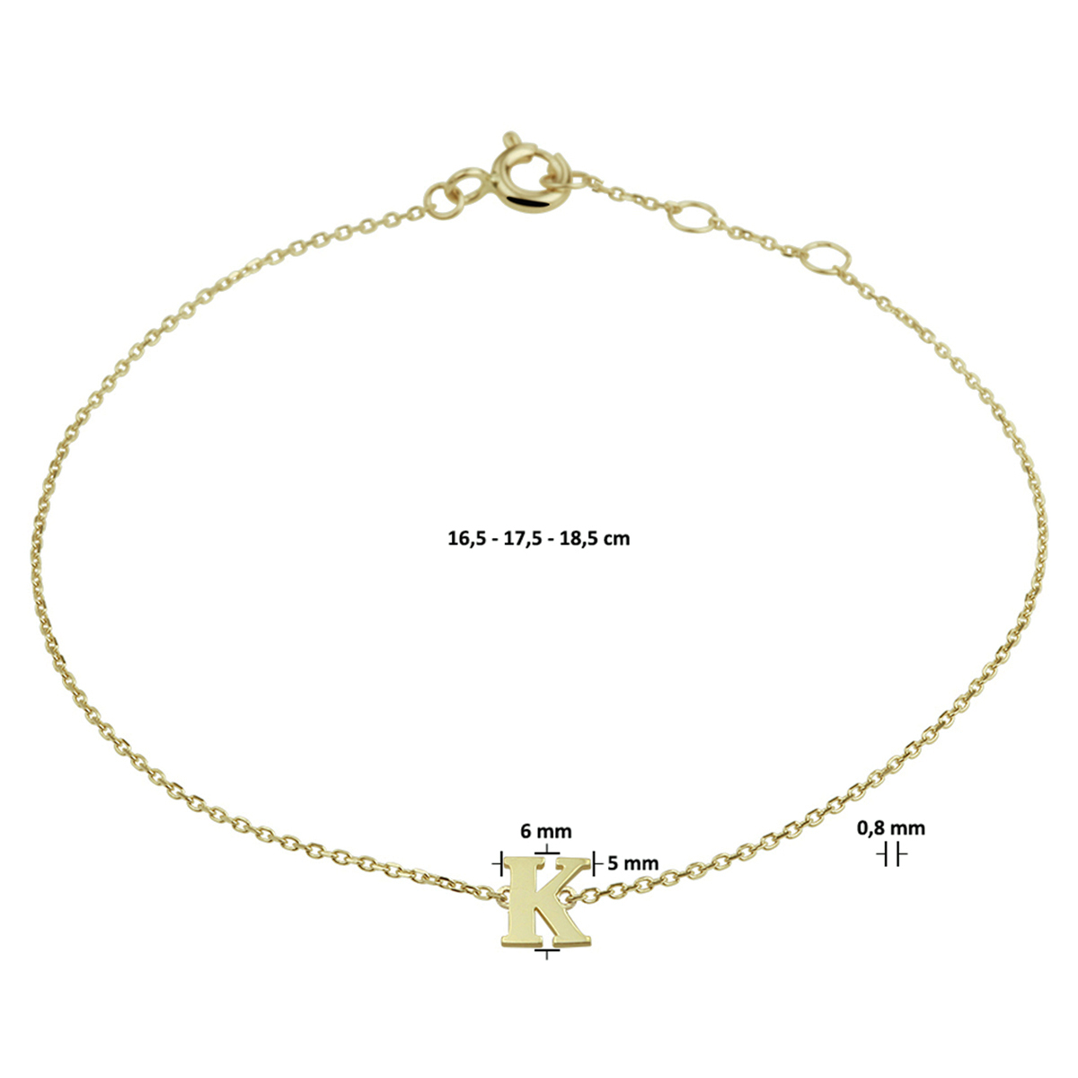 14k Geelgouden anker armband uitgevoerd met de letter K. De armband heeft draaglengtes van 16.5, 17.5 en 18.5cm. De letter heeft een afmeting van 6x5mm.