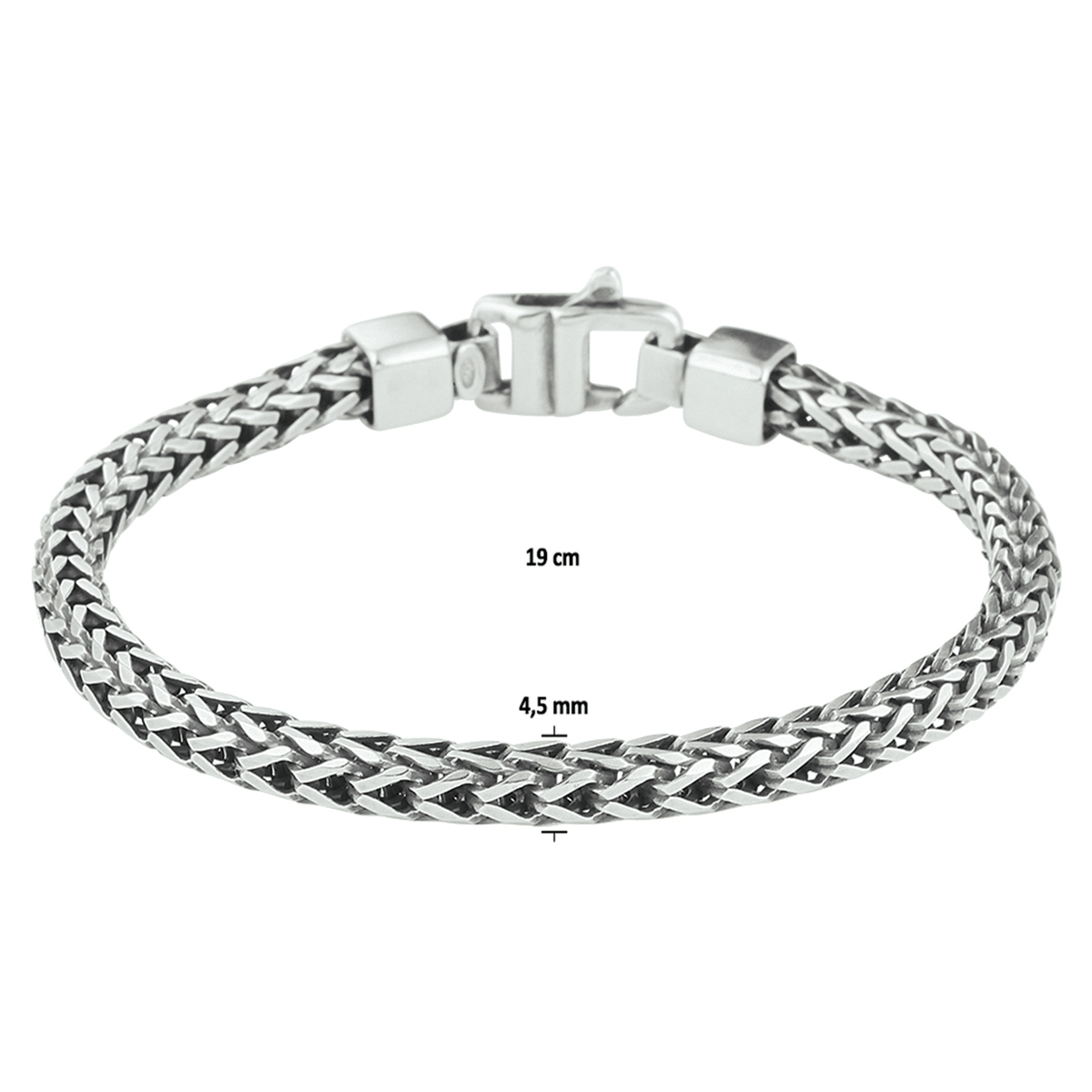Beschrijving: Stijlvolle geoxideerd zilveren armband met een vossestaart schakel. De armband heeft een draaglengte van 19cm en een schakelbreedte van 4.5mm. Uitgevoerd met een stevige karabijn sluiting.