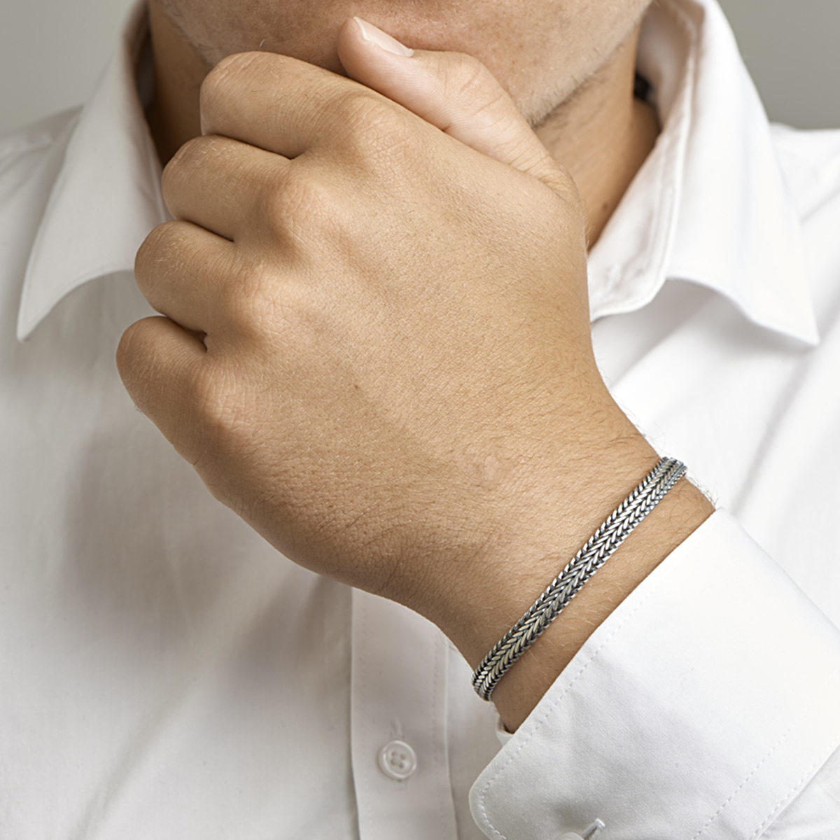 Stijlvolle geoxideerd zilveren armband met een vossestaart schakel. De armband heeft een draaglengte van 21cm en een schakelbreedte van 6.5mm. Uitgevoerd met een stevige karabijn sluiting.
