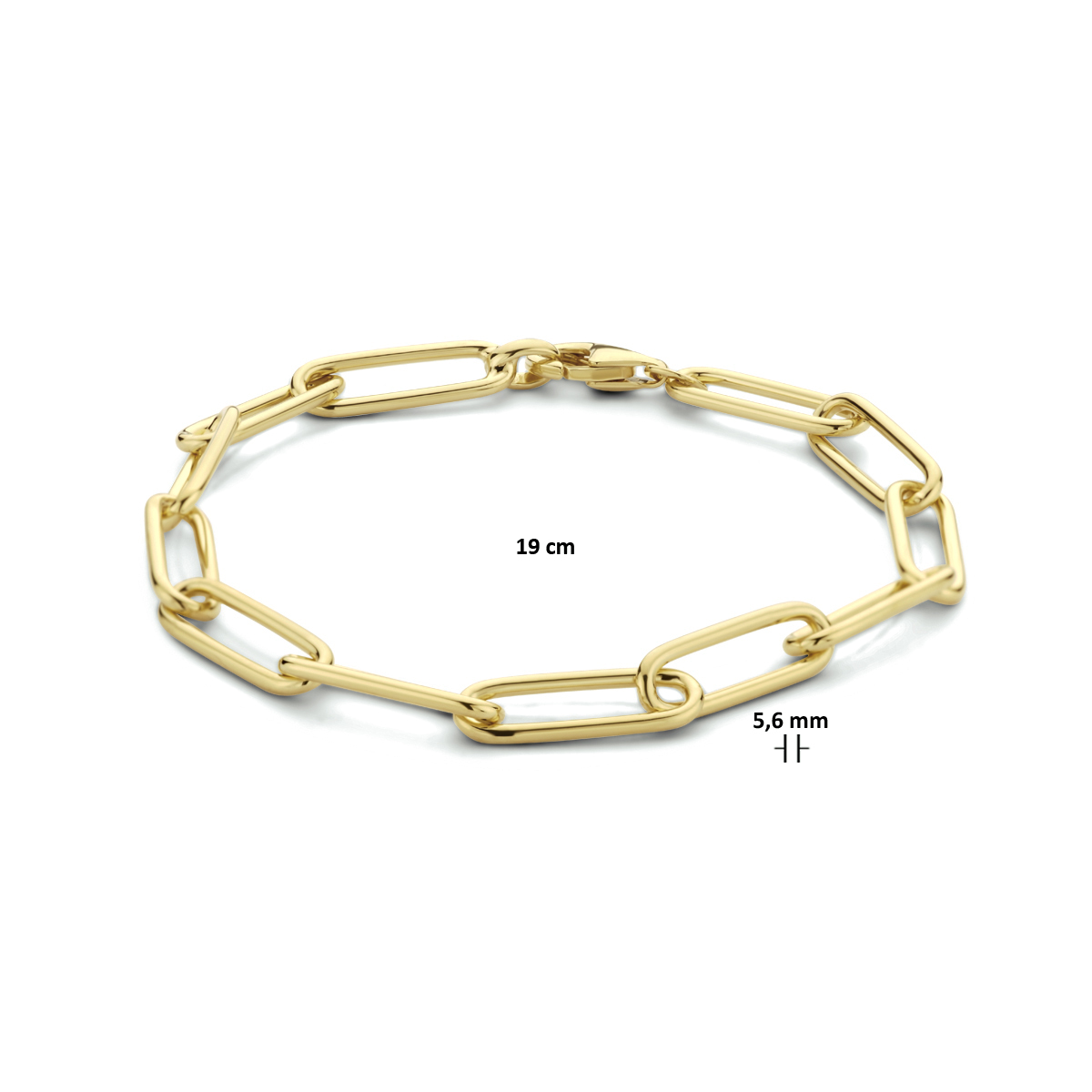 Geelgoud op 925 zilveren armband uitgevoerd met een paperclip schakel met een breedte van 5.6mm. De armband heeft een draaglengte van 19cm en een stevige karabijn sluiting. Geen garantie op plating.