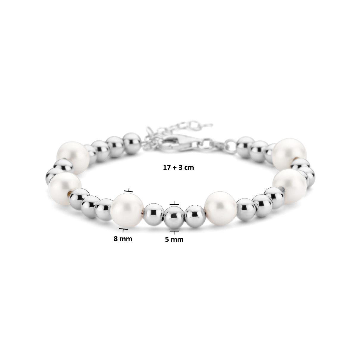 Gerhodineerd 925 zilveren armband met zoetwaterparels van 8mm en bolletjes van 5mm. De armband heeft een draaglengte van 17cm en een extensie van 3cm. Uitgevoerd met een karabijn sluiting.