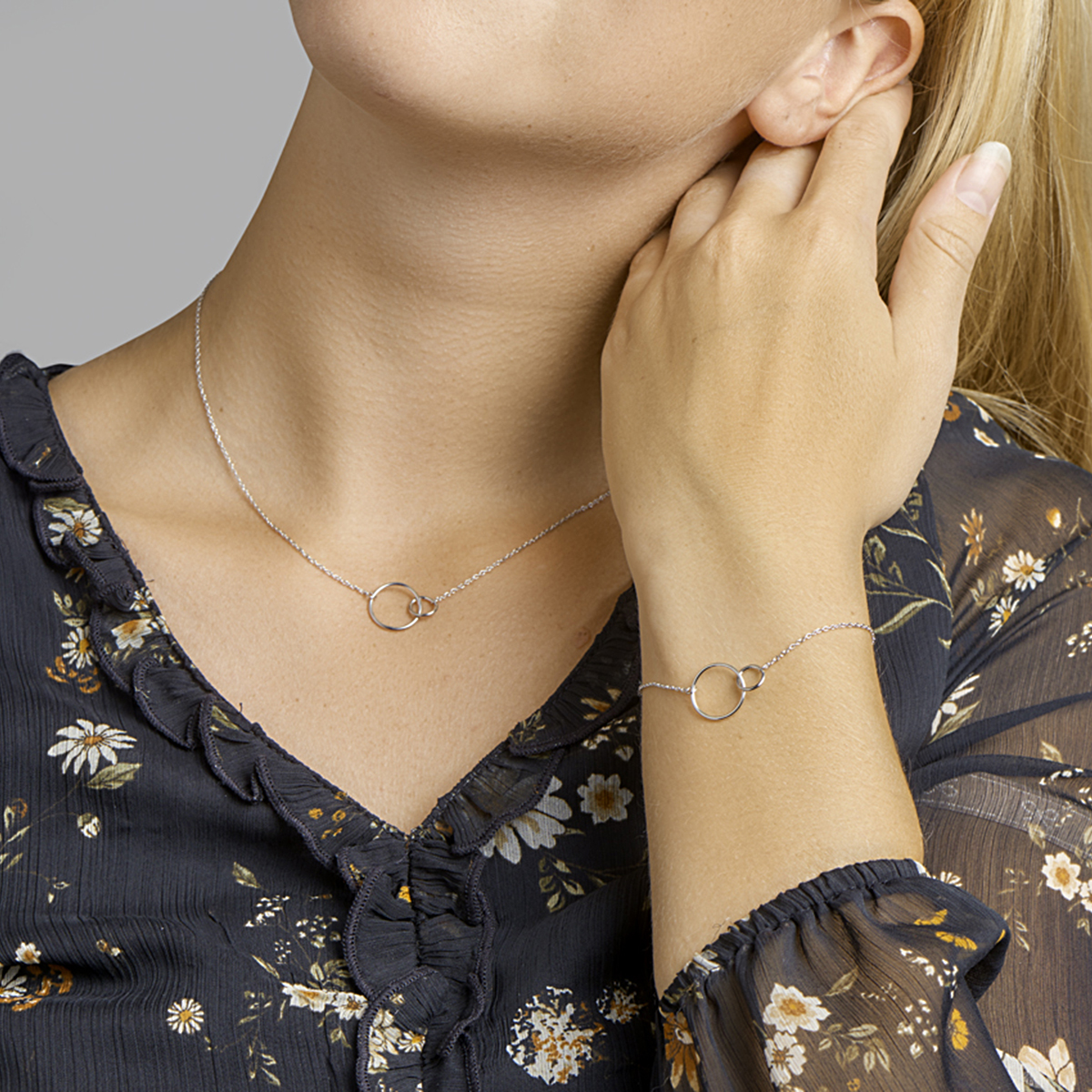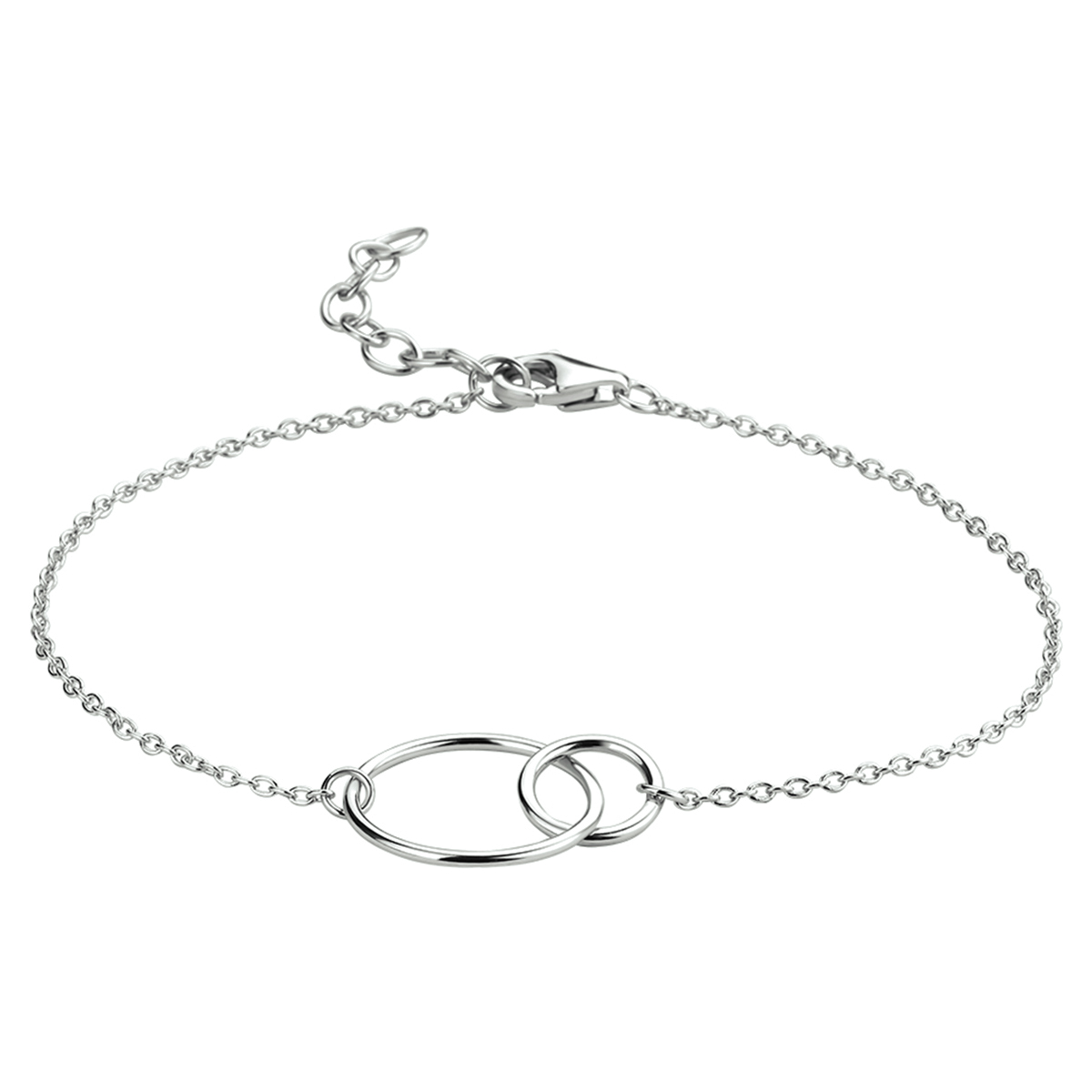 Gerhodineerd zilveren armband met open cirkels. De lengte bedraagt 16cm met 2.5cm extensie en de schakelbreedte is 1.3mm.