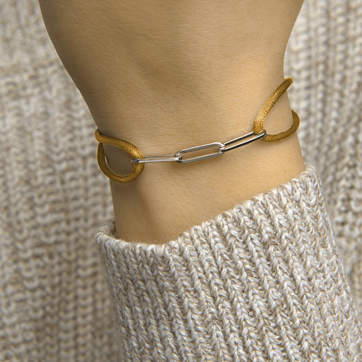Caramel gevlochten armband uitgevoerd met gerhodineerd 925 zilveren schakels met een breedte van 5mm. De armband heeft draaglengtes van 13 tot 26cm.