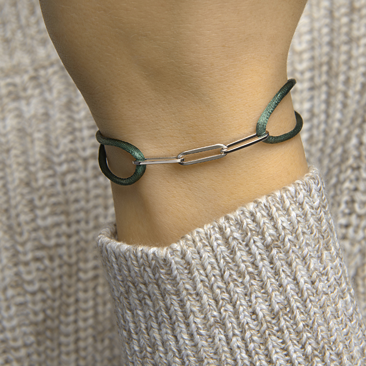 Groen gevlochten armband uitgevoerd met gerhodineerd 925 zilveren schakels met een breedte van 5mm. De armband heeft draaglengtes van 13 tot 26cm.