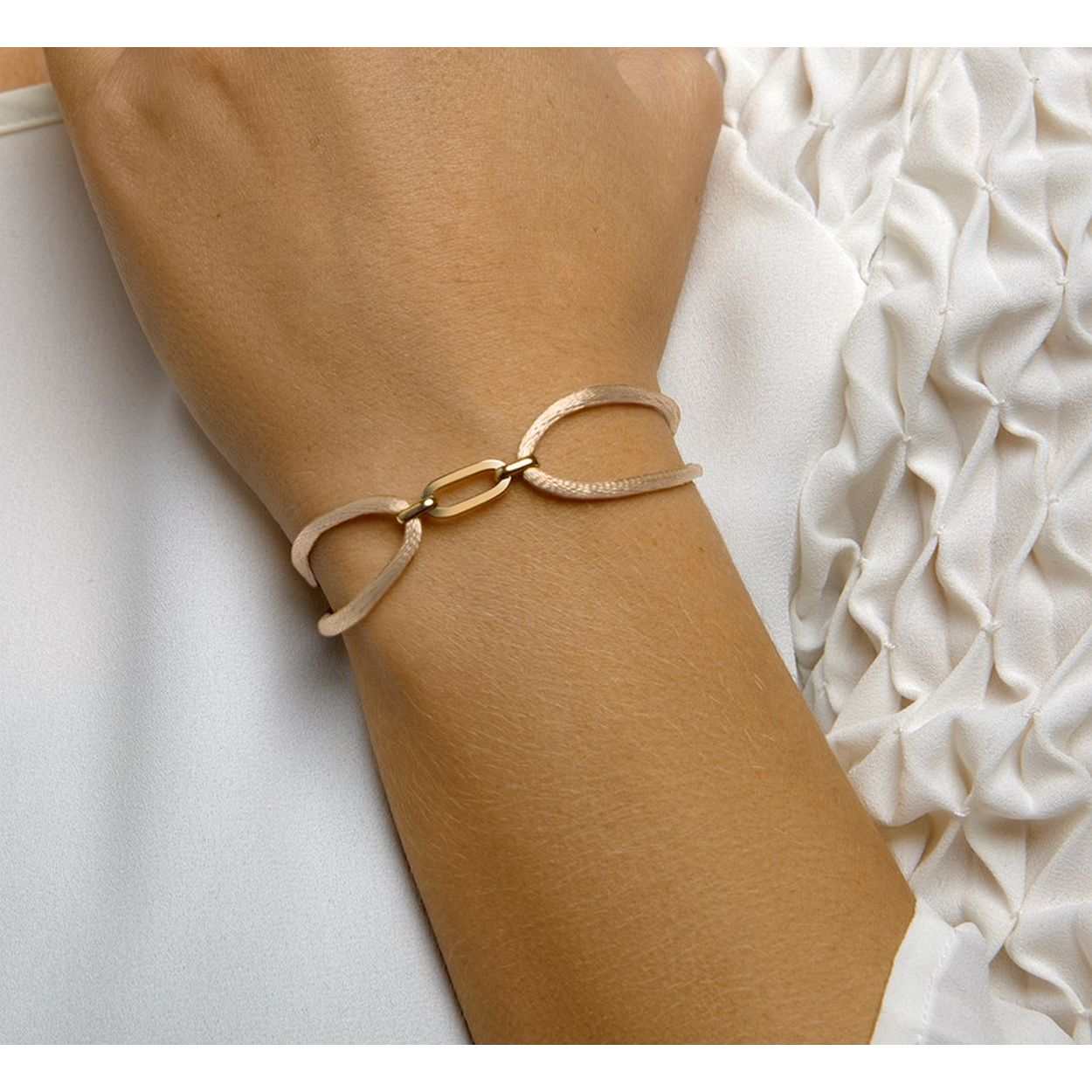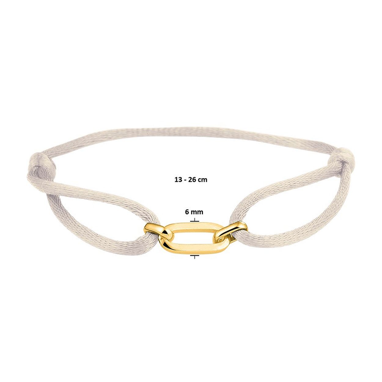 Ivoor gevlochten armband uitgevoerd met een geelgoud op 925 zilveren element. De armband heeft draaglengtes van 13 tot 26cm. Het element heeft een afmeting van 20x6mm.