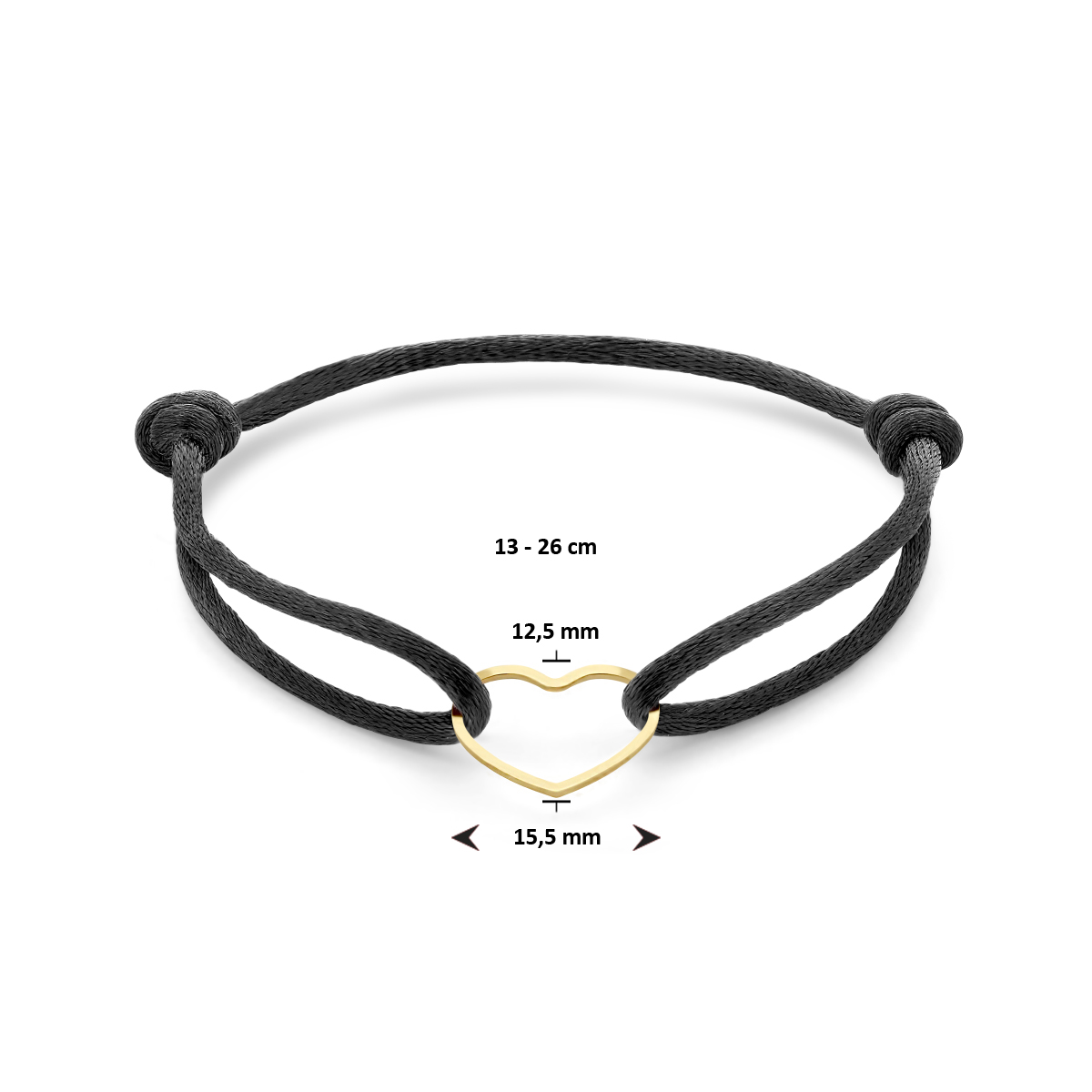 Zwart gevlochten armband uitgevoerd met geelgoud op 925 zilveren hartje. De armband heeft draaglengtes van 13 tot 26cm en het hartje heeft een afmeting van 12.5x15.5mm. Geen garantie op plating.
