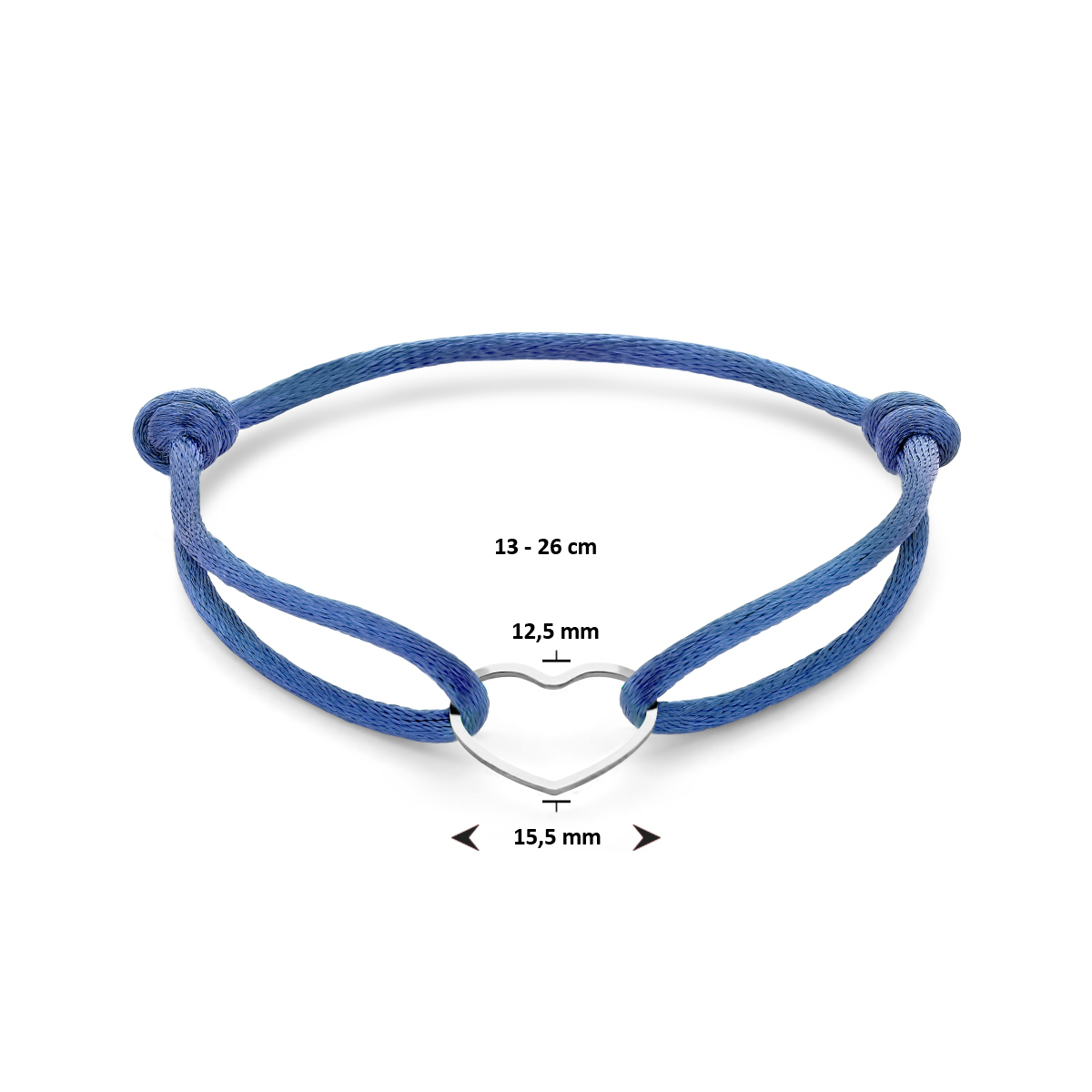 Donkerblauw gevlochten armband uitgevoerd met gerhodineerd 925 zilveren hartje. De armband heeft draaglengtes van 13 tot 26cm en het hartje heeft een afmeting van 12.5x15.5mm.