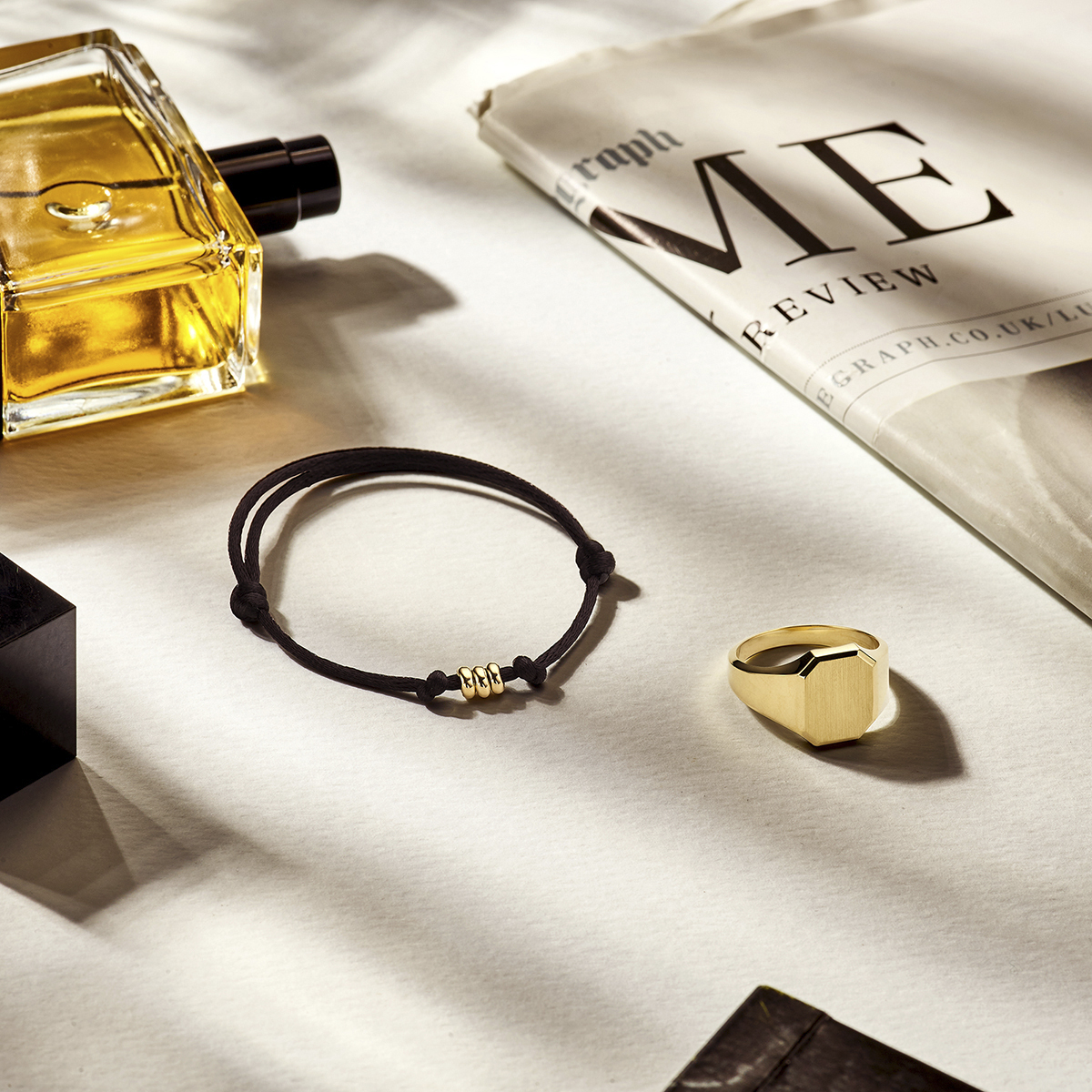 Zwart gevlochten armband uitgevoerd met 14k geelgouden ringetjes. De armband heeft draaglengtes van 17 tot 30cm. De ringetjes hebben een diameter van 4.5mm.