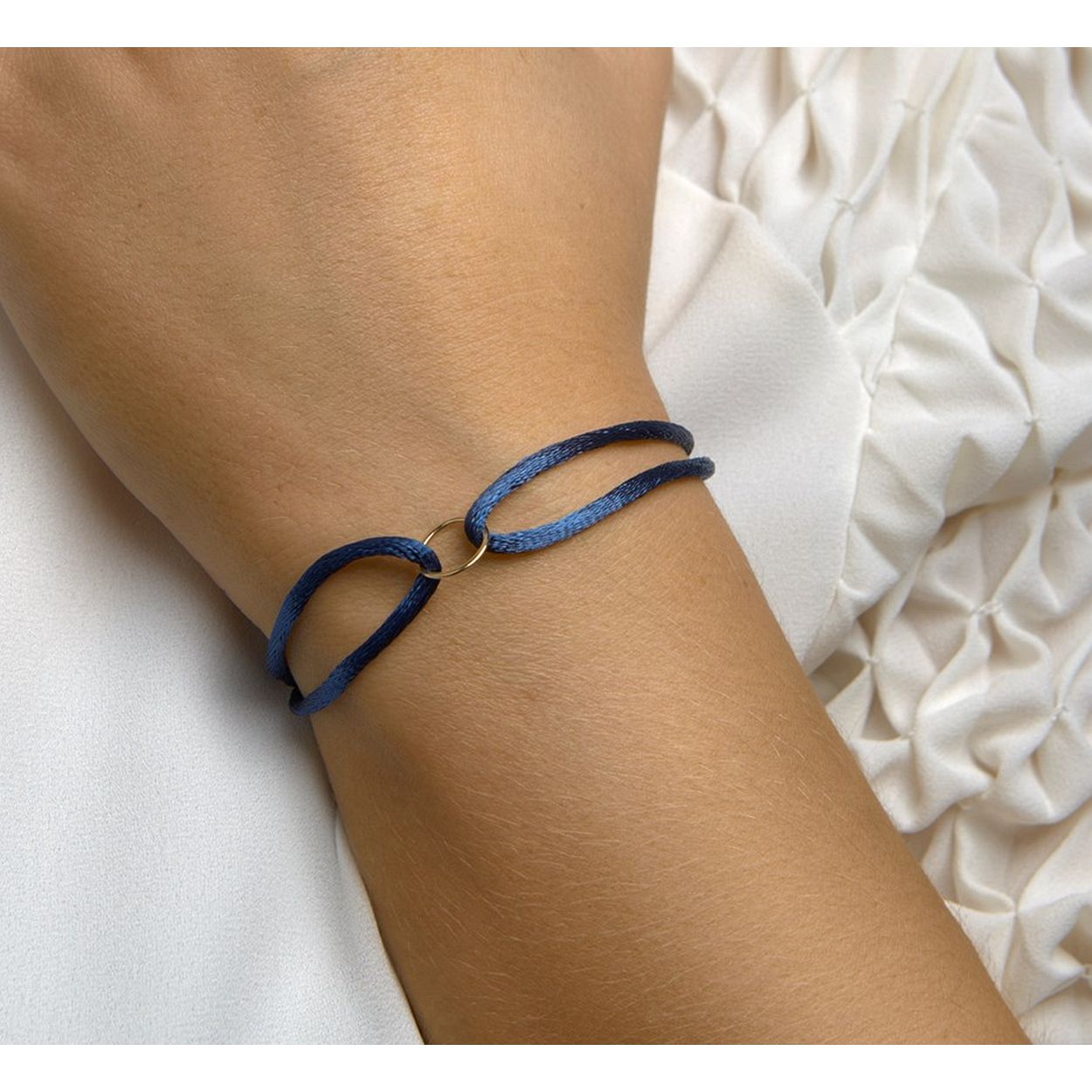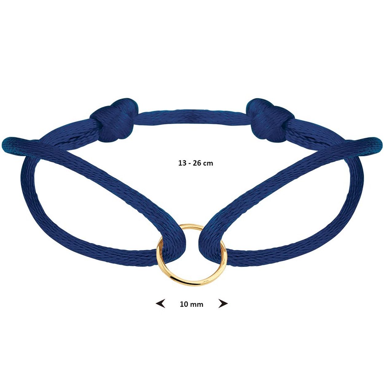 Donkerblauw gevlochten armband uitgevoerd met een 14k geelgouden rondje. De armband heeft draaglengtes van 13 tot 26cm. Het rondje heeft een diameter van 10mm.