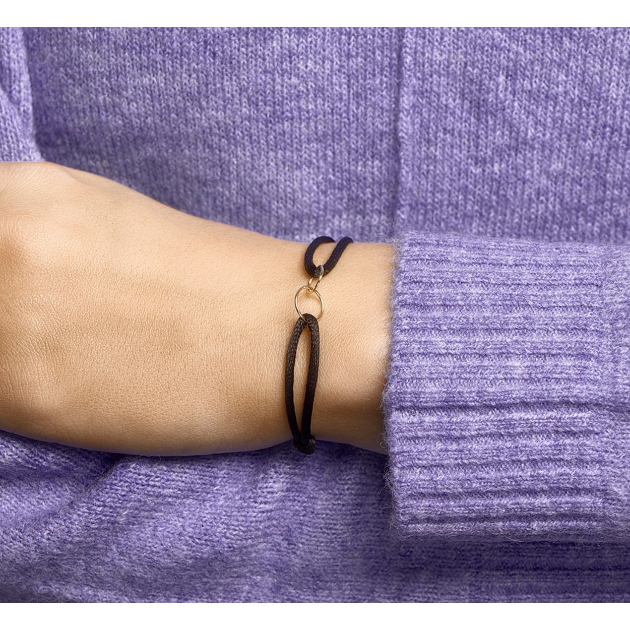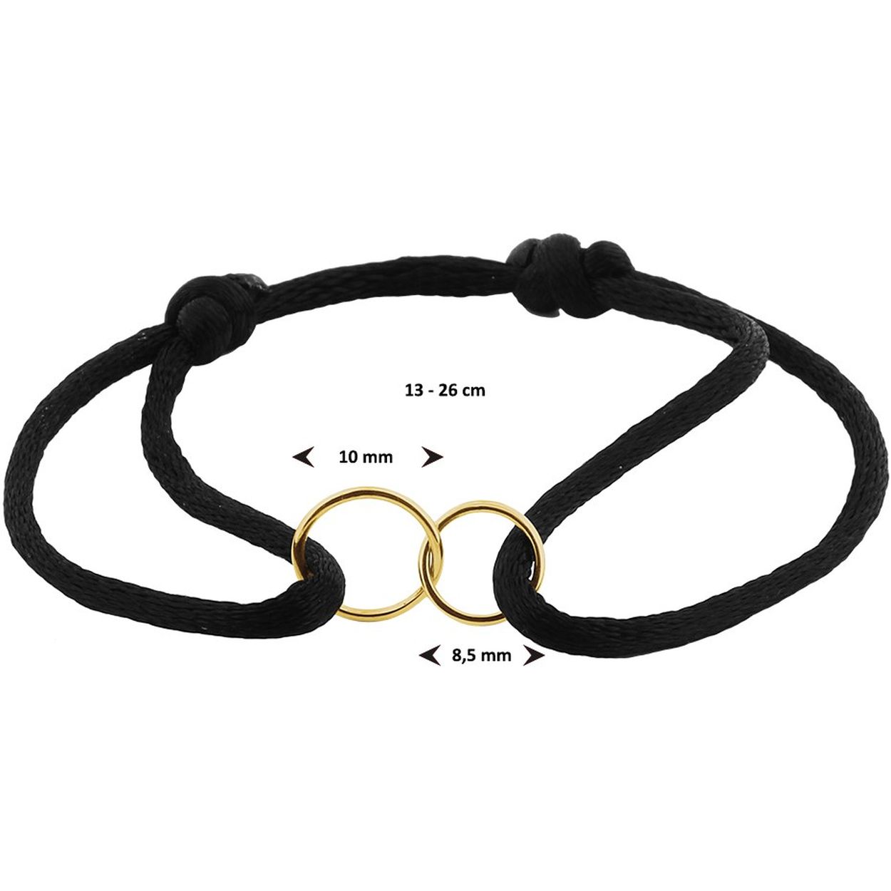 Zwart gevlochten armband uitgevoerd met twee 14k geelgouden ringen. De armband heeft draaglengtes van 13 tot 26cm. De ringen hebben een diameter van 8.5mm en 10mm.