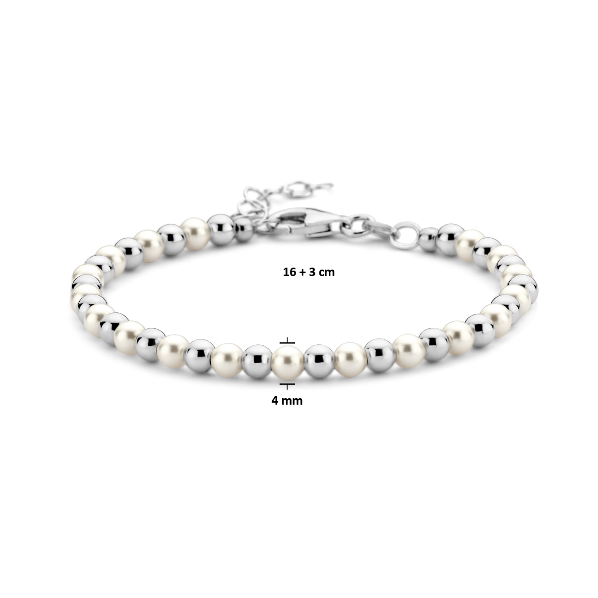 Gerhodineerd 925 zilveren armband met synthetische parels en bolletjes van 4mm. De armband heeft een draaglengte van 16cm en een extensie van 3cm. Uitgevoerd met een karabijn sluiting.