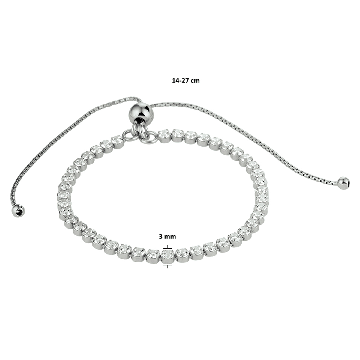 Gerhodineerd zilveren armband uitgevoerd met schitterende zirkonia. De armband heeft een draaglengte van 14 tot 27cm. Info: Gerhodineerd zilver is door de rhodiumlaag beter bestand tegen verkleuren en krassen.