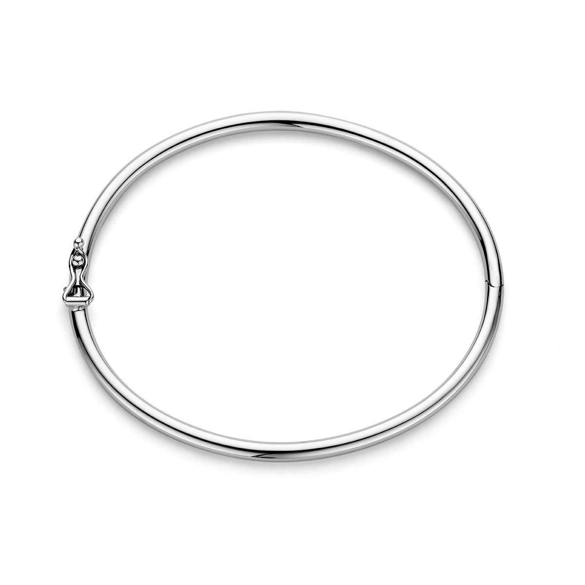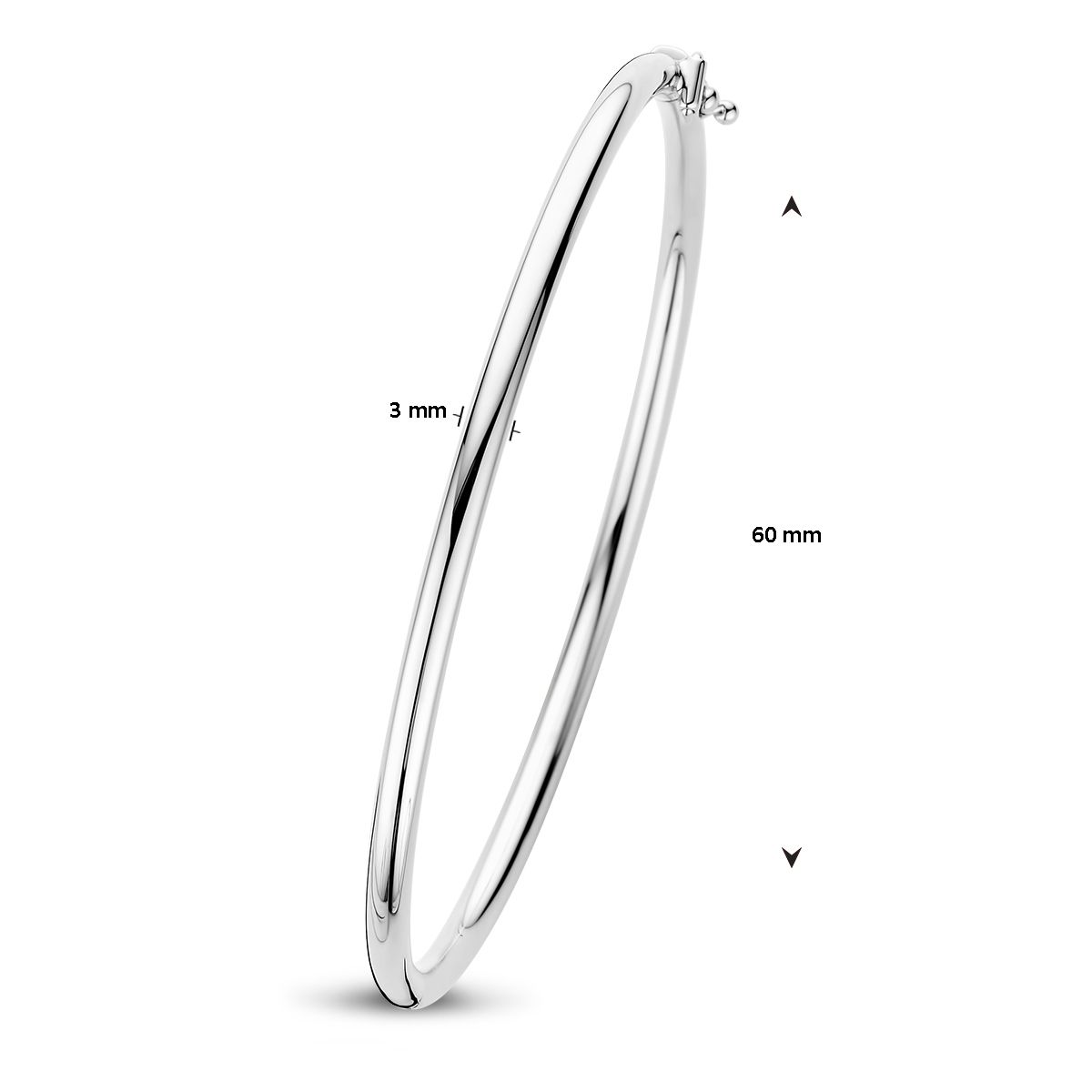 Witgouden bangle armband  met ronde buis en is uitgevoerd met een stevige scharnier sluiting. De bangle armband  heeft een diameter van 60mm en een breedte van 3mm.