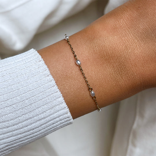 De goudkleurige Essentielle Pearl Chain armband heeft een roestvrijstalen ketting met glazen parels. De armband is verstelbaar in maat van minimaal 160 mm tot maximaal 200 mm. Hij past perfect bij de goudkleurige Essentielle Pearl Chain Ketting.