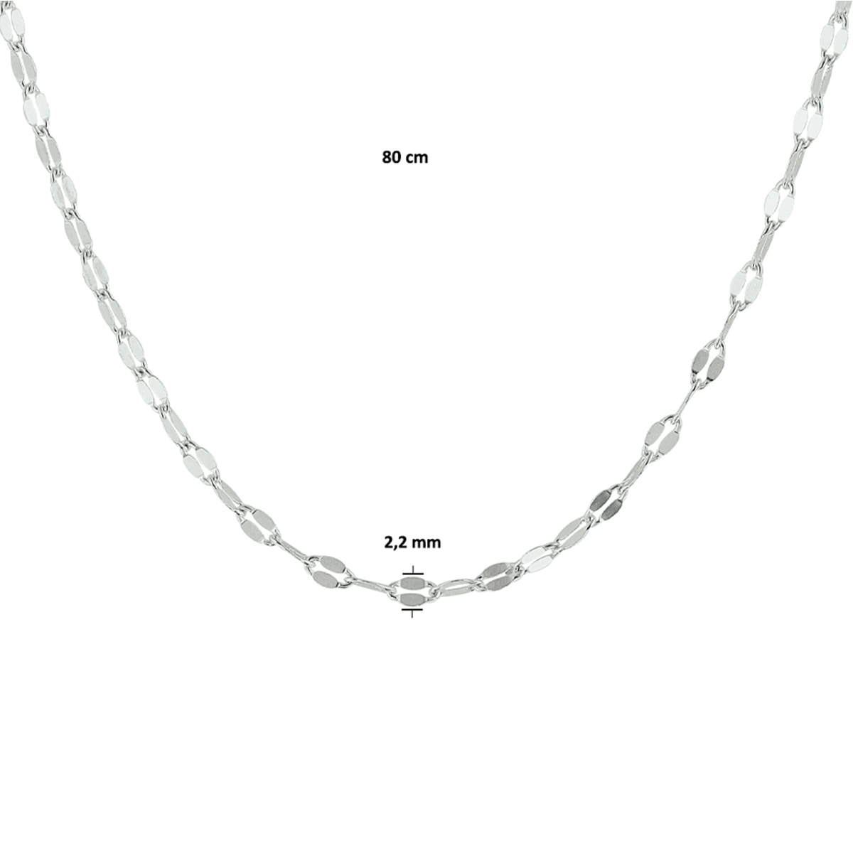 Gerhodineerd zilveren collier uitgevoerd met een stevige karabijn sluiting. Het collier heeft een schakelbreedte van 2.2mm en een draaglengte van 80cm. Door het simplistische design gemakkelijk te combineren met andere zilveren sieraden. Info: Gerhodineerd zilver is door de rhodiumlaag beter bestand tegen verkleuren en krassen.