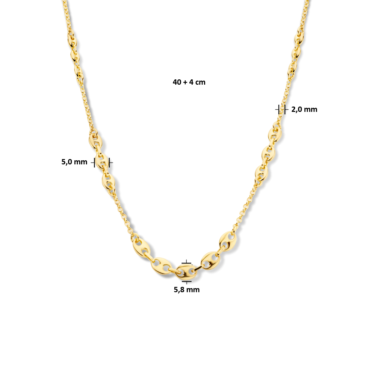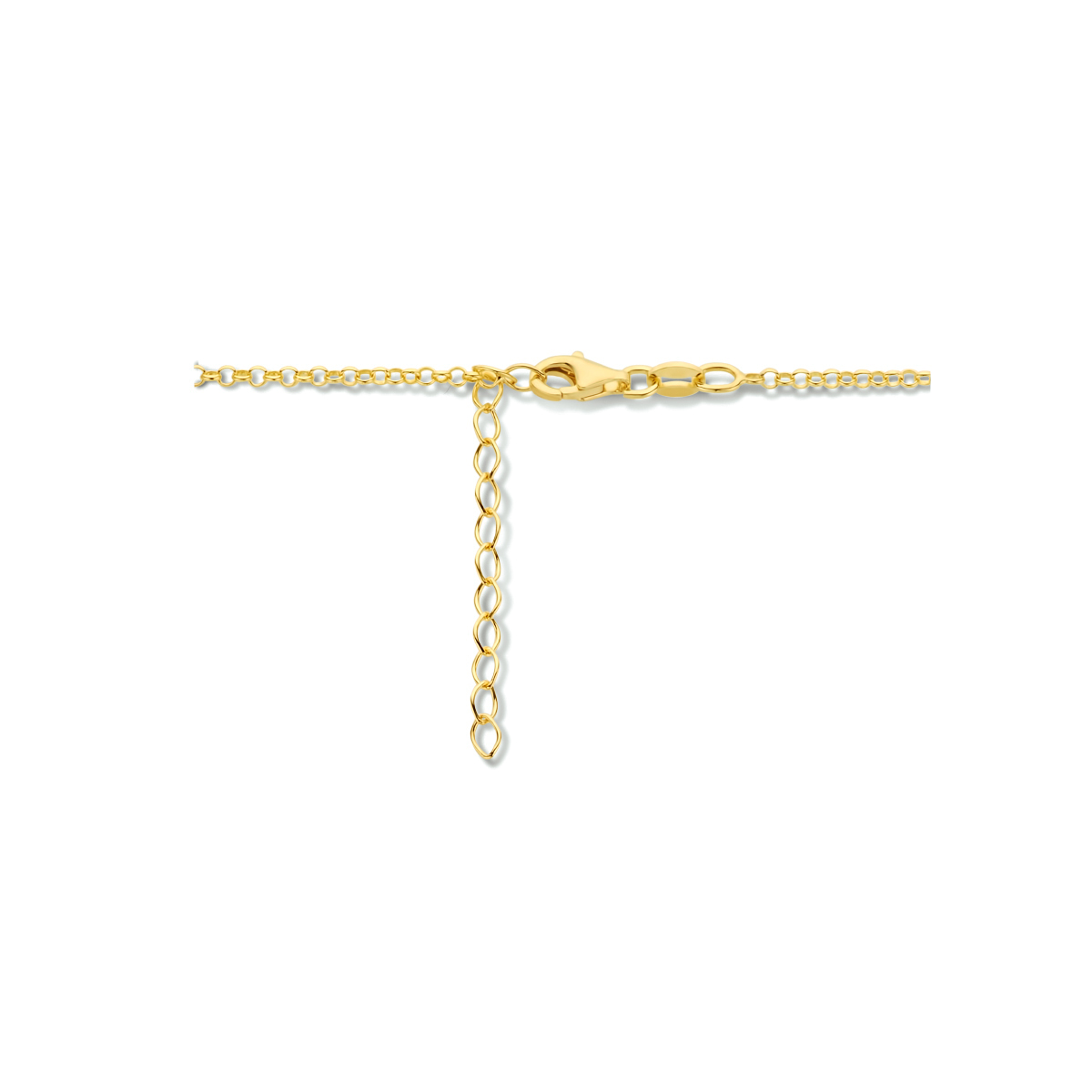 Geelgoud op 925 zilveren schakelcollier uitgevoerd met een karabijn sluiting. Het collier heeft een draaglengte van 40cm en een extensie van 4cm. Geen garantie op plating.