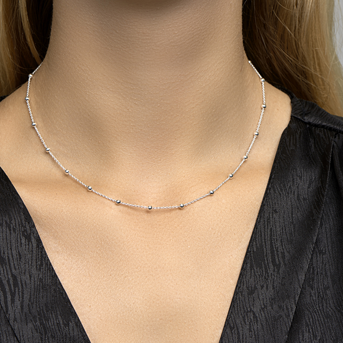 Beschrijving: Zilveren collier met bolletjes.