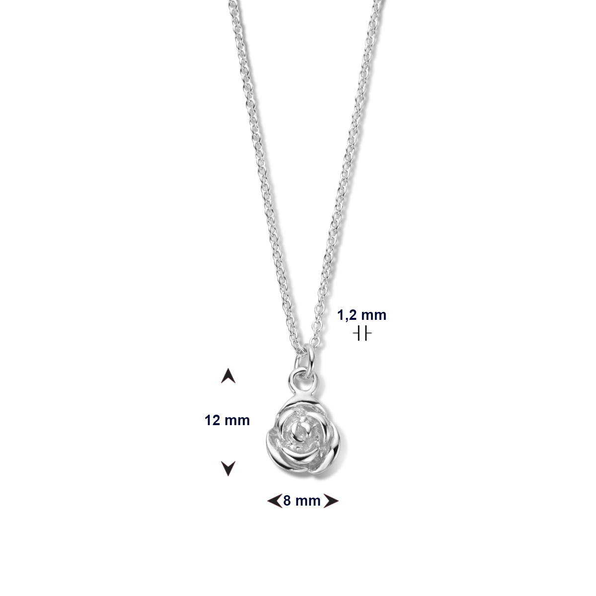 Gerhodineerd 925 zilveren collier uitgevoerd met een bloem. Het collier heeft een schakelbreedte van 1.2mm en een karabijn sluiting. De draaglengte is 41cm met een extensie van 4cm.