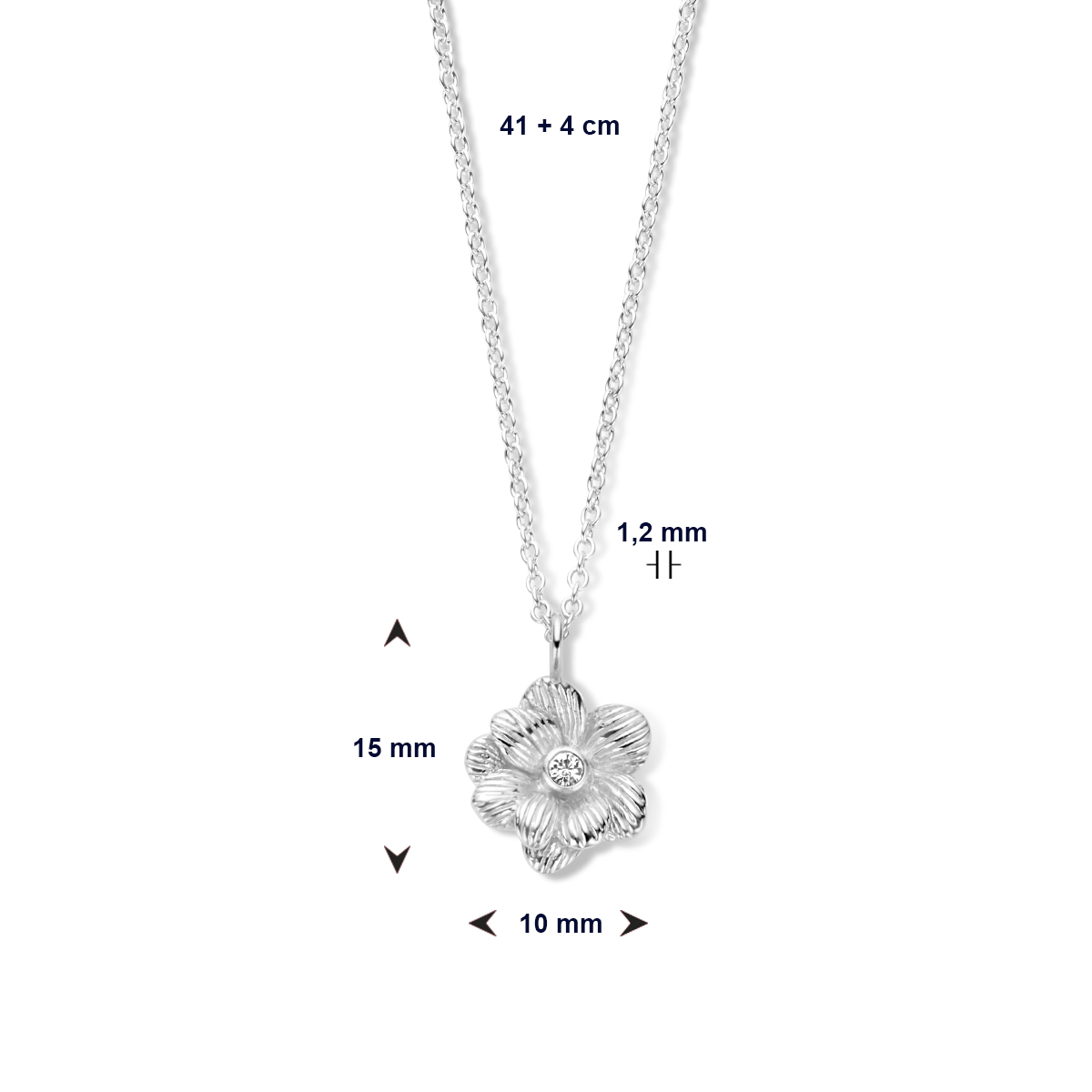 Gerhodineerd 925 zilveren collier uitgevoerd met een bloem. Het collier heeft een schakelbreedte van 1.2mm en een karabijn sluiting. De draaglengte is 41cm met een extensie van 4cm.
