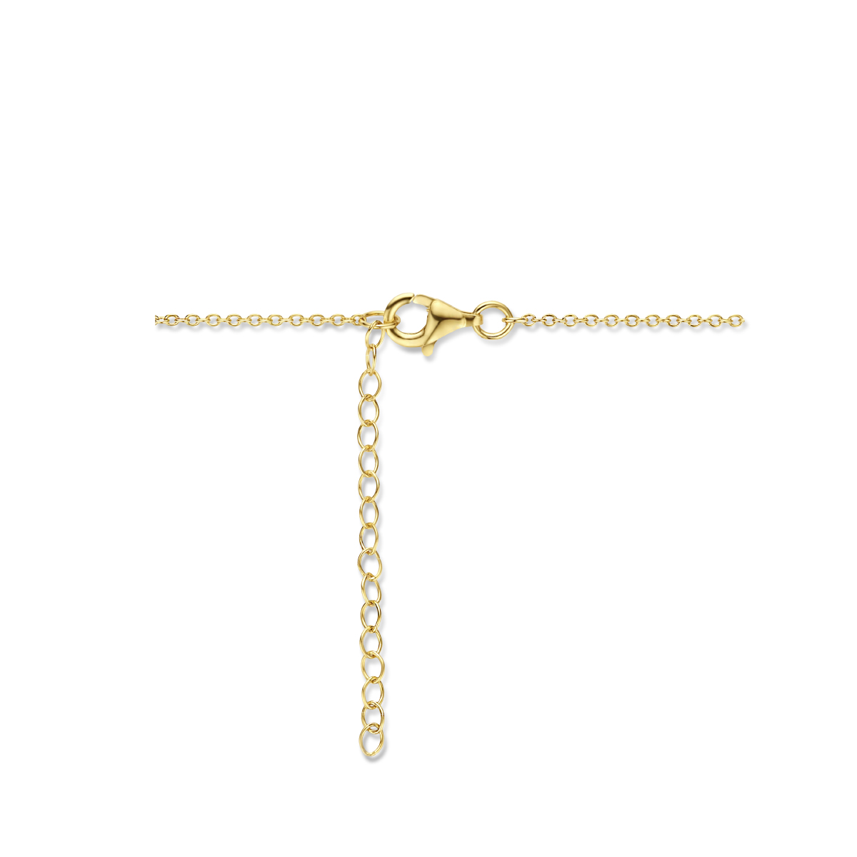 Geelgoud op 925 zilveren collier uitgevoerd met een bloem. Het collier heeft een schakelbreedte van 1.2mm en een karabijn sluiting. De draaglengte is 41cm met een extensie van 4cm. Geen garantie op plating.