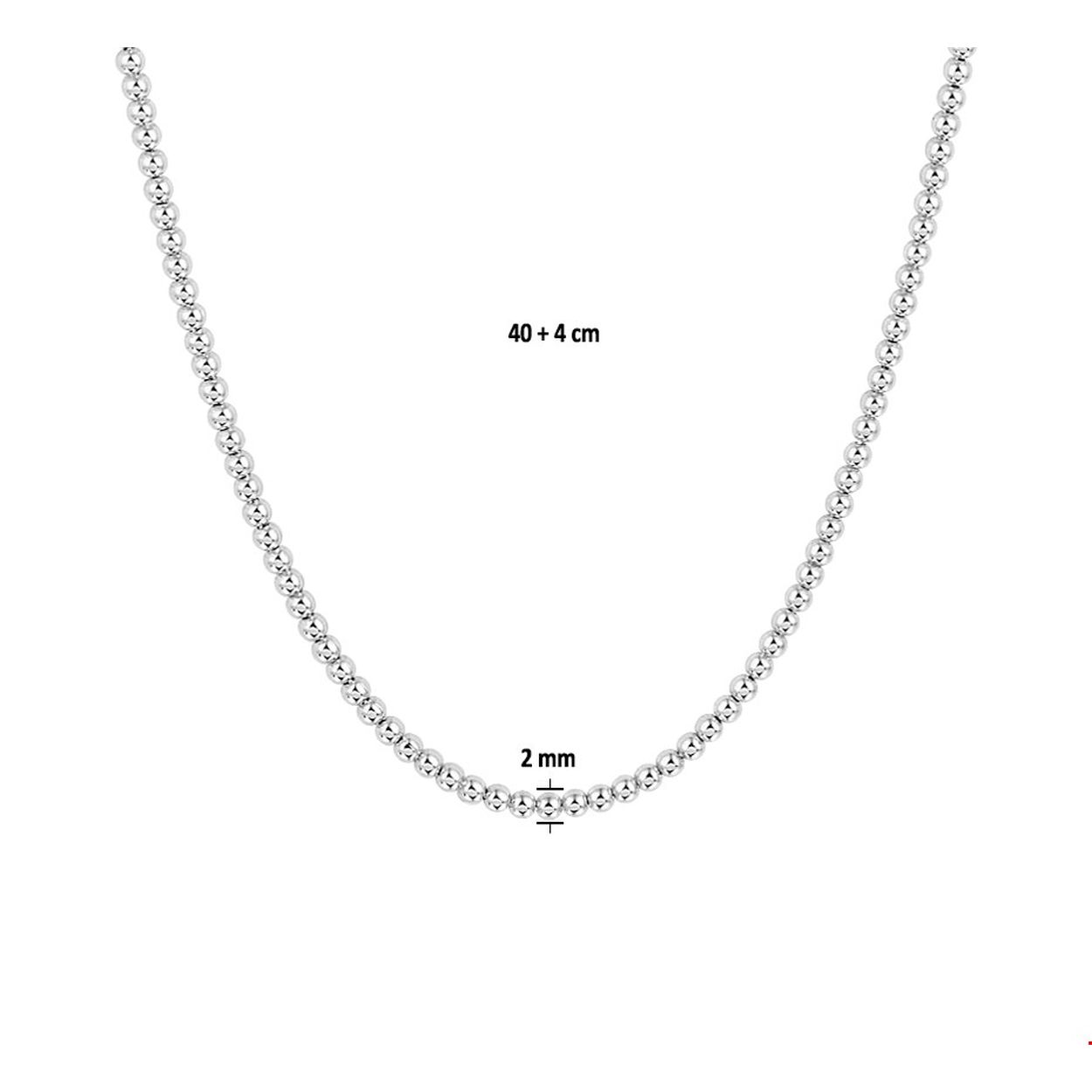 Trendy gerhodineerd zilveren collier met een draaglengte van 40cm en een extensie van 4cm. Uitgevoerd met bolletjes van 2mm in diameter en een stevige karabijn sluiting. Info: Gerhodineerd zilver is door de rhodiumlaag beter bestand tegen verkleuren en krassen.