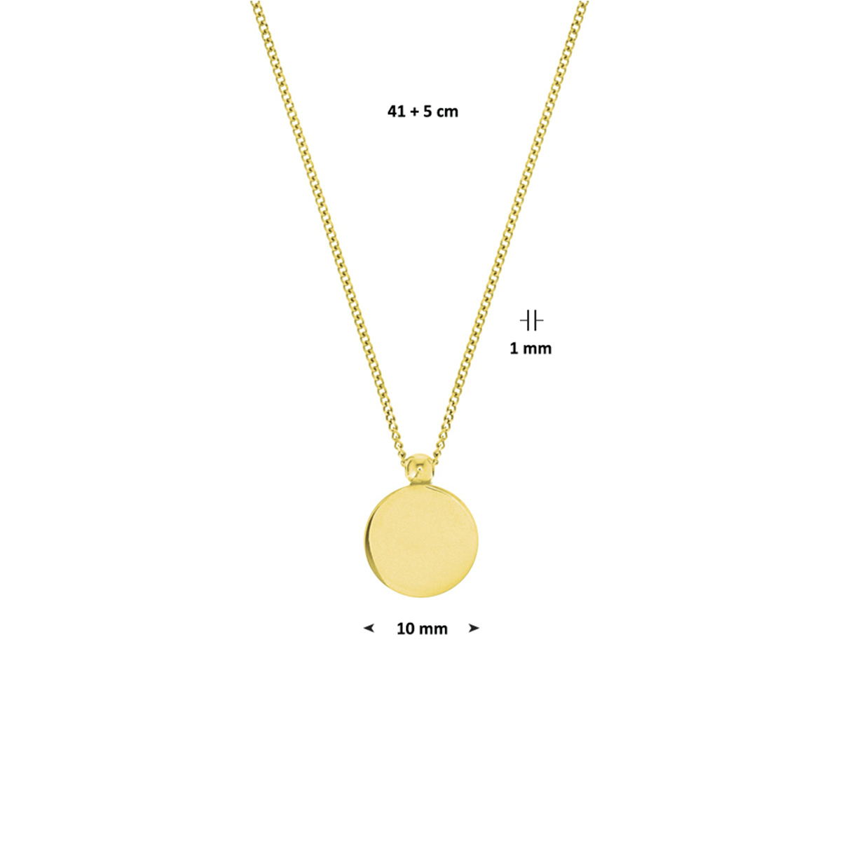 Beschrijving: Geelgoud op zilveren gourmet collier met een ronde hanger en een stevige karabijn sluiting. Het collier heeft een draaglengte van 41cm en een extensie van 5cm. De schakelbreedte is 1mm en het rondje heeft een diameter van 10mm. Door het simplistische model is dit collier met hanger gemakkelijk te combineren met andere sieraden uit onze collectie of uit je eigen stash!