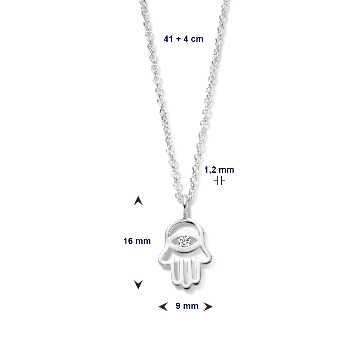 Gerhodineerd 925 zilveren collier uitgevoerd met het handje van fatima en zirkonia. Het collier heeft een schakelbreedte van 1.2mm en is uitgevoerd met karabijnsluiting. De draaglengte is 41cm met een extensie van 4cm.